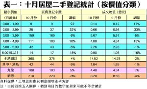 按樓價作分析(見表一),當中4個價格組別交投量錄得減少,其中跌幅最大的是價值200萬元至300萬元以內組別,十月份錄25宗二手居屋登記,按月急跌32%;其次,600萬元或以上者亦跌18%;至於登記量最活躍的300萬至400萬元以內組別則錄159宗,較九月份的169宗少10宗或6%。如以地區劃分,新界區十月份錄210宗登記,按月減少18宗或約8%;港島區錄42宗,比起前月少2宗或約5%;至於九龍區期內錄108宗,按月上升約5%,為三區中唯一錄增幅的地區。