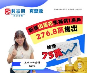 利嘉閣地產上水中心分行首席聯席董事黃靜顏(Yen)表示,該行客戶經理李文娟(Carrie)最新促成粉嶺山麗苑E座中層8室的二手成交個案,單位實用面積約376方呎,屬1房間隔,望開揚景致。
