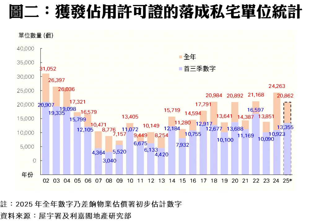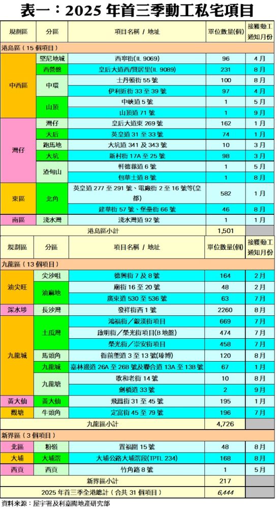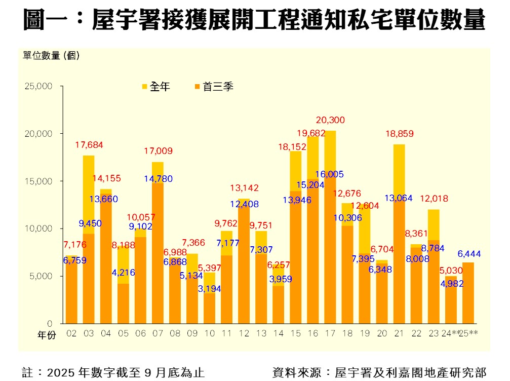 利嘉閣地產研究部主管陳海潮表示,經之前一連兩個月上衝後,動工量再度轉慢。根據屋宇署今日發表的最新數據,2025年九月份全港共有2個私人住宅項目動工(按屋宇署接獲上蓋建築工程動工通知為準),包括九龍塘劍橋道33號(2伙)及山頂山頂道 71號(1伙)。至於,今年首三季私宅動工量累計6,444伙,較去年同期增加29%,並已超越去年全年動工量(5,030伙)約28%。