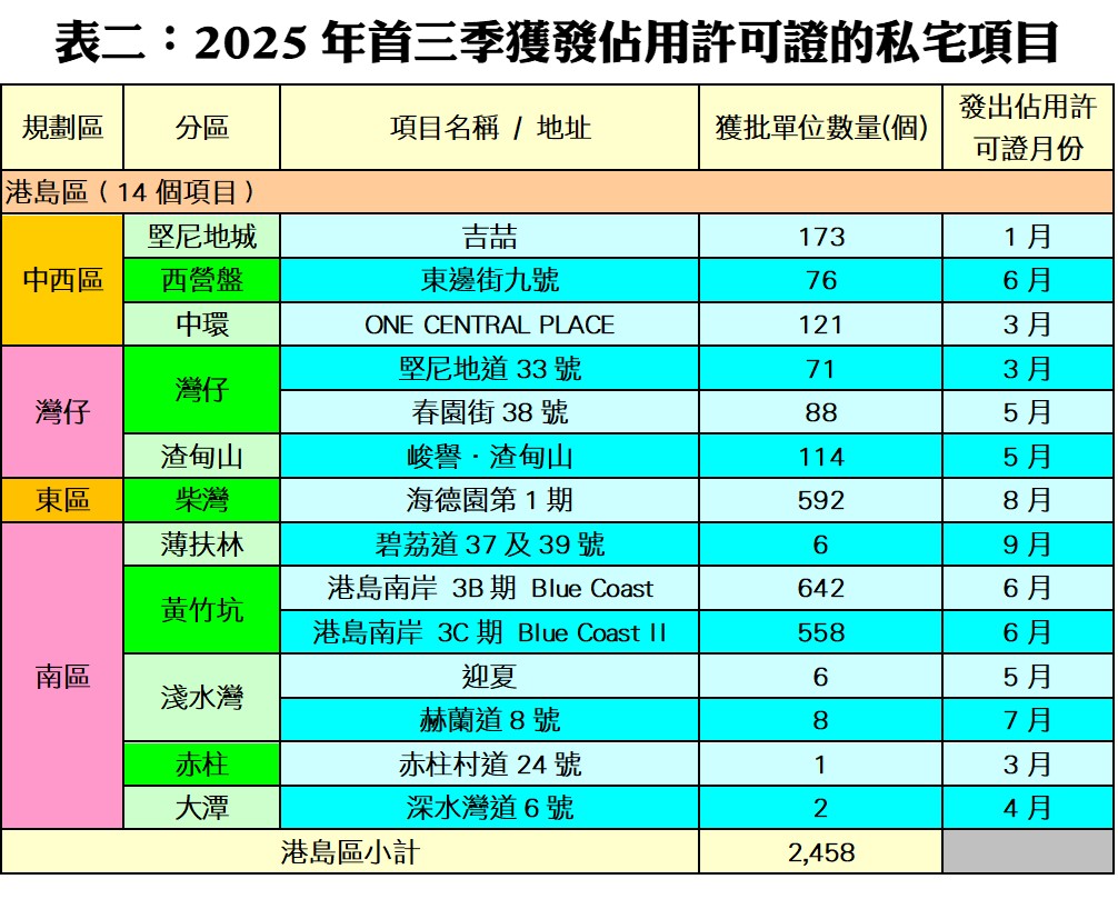 按地區劃分,今年首三季九龍區共有23個項目、合共8,105個單位落成,佔整體比例約60.7%;港島區共有14個項目落成,涉及單位總數2,458伙,佔同期整體私宅落成量逾18.4%;新界區則有7個項目落成,涉及2,792伙,佔整體私宅落成量約20.9%。