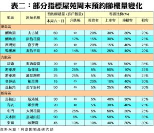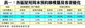 按地區劃分,港島、九龍及新界三區指標屋苑的周末預約睇樓量全線向上,其中以港島區增幅較明顯,該區8個指標屋苑本周末暫錄235組客戶預約睇樓,按周增加4.4%。利嘉閣地產逸樺園分行聯席董事吳玉蘭表示,由於部分睇樓客回流至二手市場,帶動本周末康怡花園預約睇樓人數較上周末增加;她補充,本月樓市整體氣氛熾熱,吸引區內買家換樓或上車置業,亦有業主看準時機加價放盤,開價升幅約3%至5%。