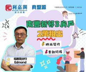利嘉閣地產康怡區助理營業董事丁培鴻(Sam)稱,栢蕙苑分行高級客戶董事黃俊雄(Edmond)近日促成鰂魚涌南豐新邨10座低層E室的二手租賃成交個案,單位實用面積約516方呎,採3房間隔,外望開揚景觀。