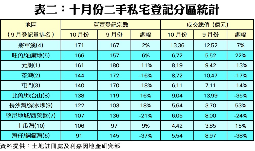 按全港三區作分析,十月份港九新界三區登記量錄得兩跌一升。當中,港島區登記量按月微跌3宗,月內錄813宗登記;九龍區按月升10%,錄得1,077宗登記;至於新界區則跌5%,只有1,432宗。另外,十大最活躍成交分區的登記量則升跌各半,當中以長沙灣/深水埗區的升幅最大,月內有122宗登記,按月漲18%。至於北角/炮台山區及土瓜灣區亦分別錄得16%及9%的升幅,前者錄138宗,後者有106宗登記。