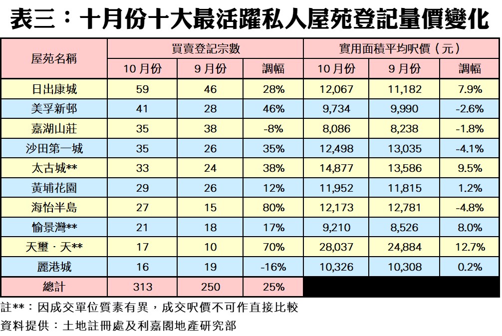 此外,上月十大活躍二手私人屋苑登記量中,錄得八升兩跌,其中以海怡半島的升幅最凌厲,月內錄得27宗登記,按月漲80%;其次天璽‧天及美孚新邨也分別升70%及46%,各錄17及41宗登記。至於,登記量錄得跌幅者,以麗港城跌勢最大,按月少16%,錄得16宗登記,而嘉湖山莊也跌8%,錄35宗登記,至於日出康城依然是登記量最活躍的屋苑,錄59宗,按月升28%。此外,十月份十大活躍屋苑總計登記量共有313宗,較九月份的250宗增加25%。