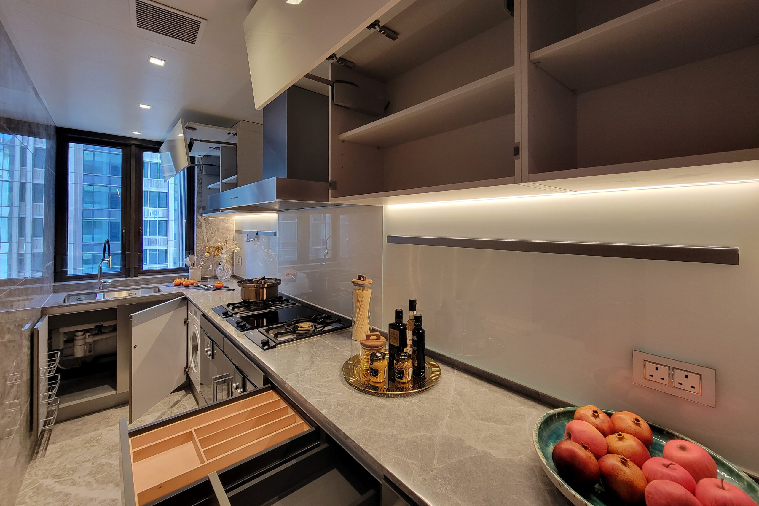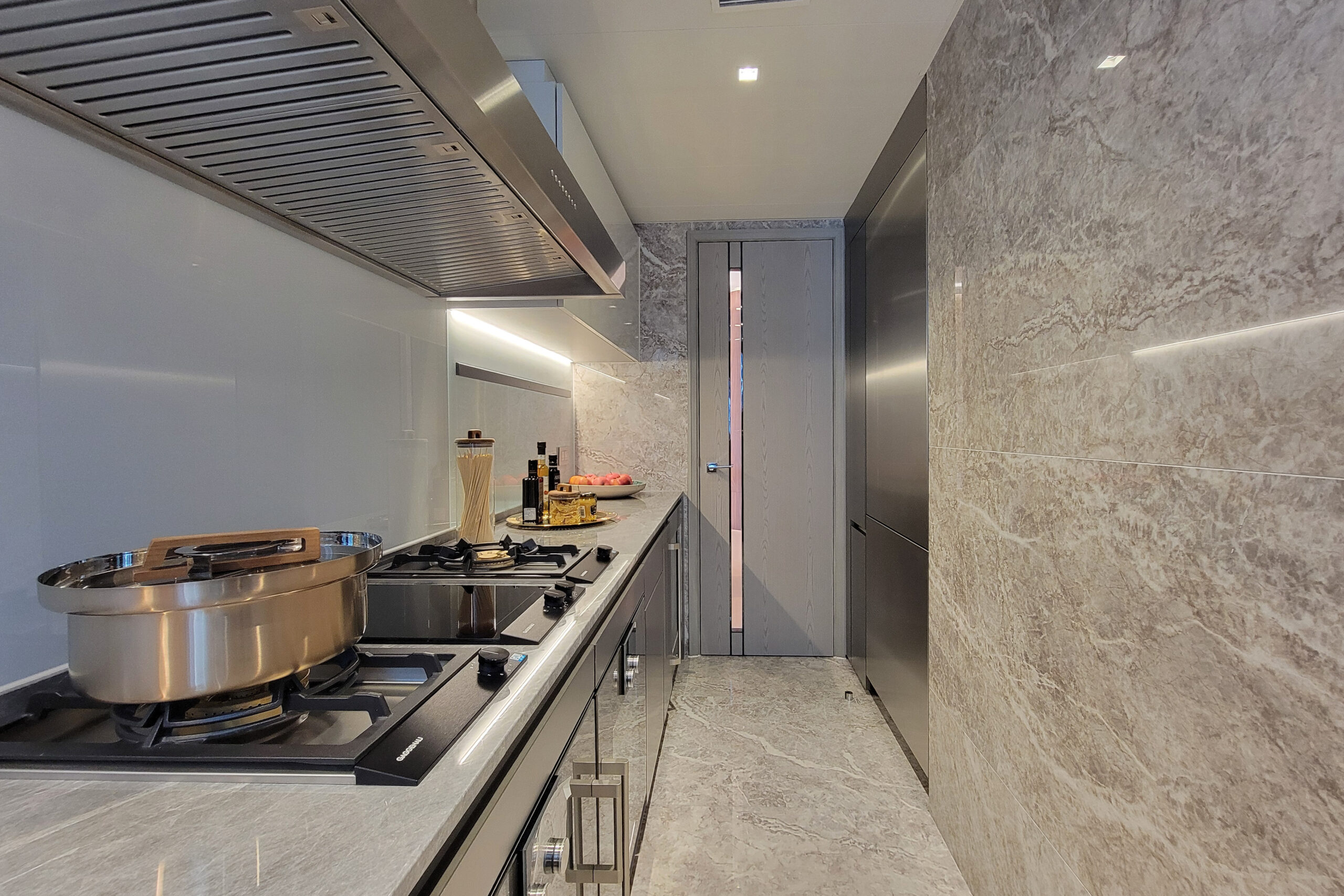 廚房採用德國品牌LEICHT廚櫃,並採用電動鉸門設計,配合L型工作枱面,提供充裕的備餐空間。廚房亦配備一系列德國品牌Gaggenau廚房家電,包括雪櫃、抽油煙機、煤氣煮食爐、電磁爐、蒸爐、焗爐、洗衣/乾衣機及酒櫃。