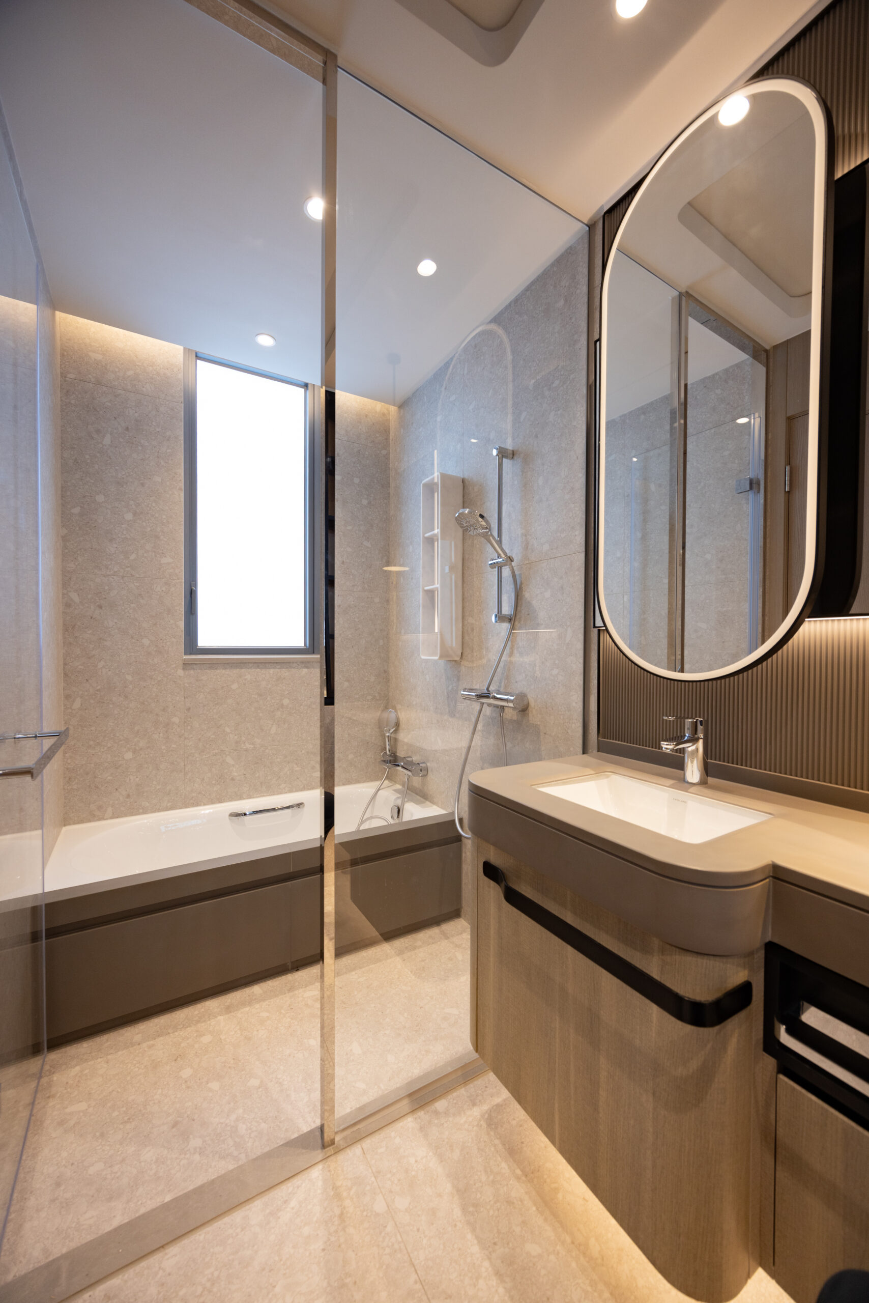 主人睡房設L型落地玻璃幕牆,廣闊海景盡收眼底。房間間隔寬敞方正,住戶擺放雙人床及衣櫃後仍有充裕空間。主人浴室採用四件頭設計,配置浴缸、淋浴間、坐廁及洗手盆,並配備電熱水爐及內置抗菌過濾網的Panasonic浴室寶,配合窗戶令室內空氣流通,時刻保持浴室乾爽衛生;同時備有不少收納空間及電插座。
