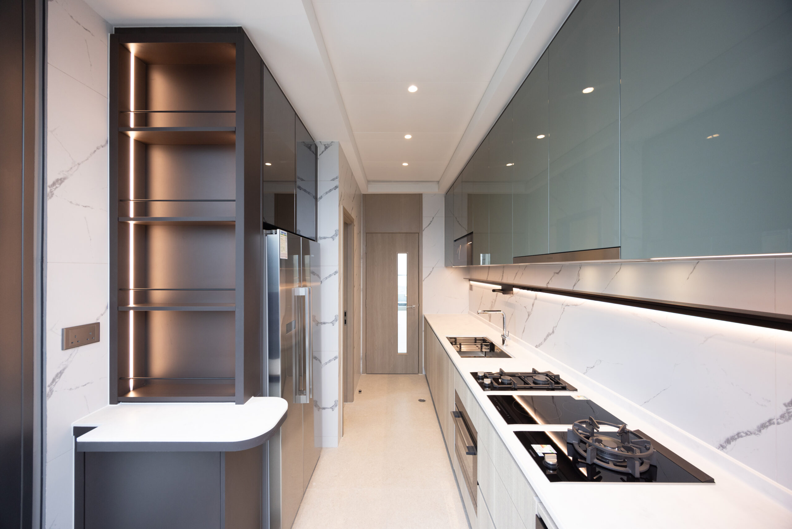 梗廚設計同樣方正,配置全套德國SIEMENS西門子嵌入式電器,包括煤氣爐、電磁爐、7合1智能微蒸烤焗爐、抽油煙機、雪櫃、洗衣機及乾衣機,同時亦配備酒櫃。長型灶台打造寬敞的備餐空間,配搭淺木色地櫃以及深綠色吊櫃,與室外山林景致互相呼應。廚房內亦提供大量儲物空間方便住戶擺放各種廚具、碗碟及食材等;另一邊亦特意設置早餐區。廚房同時亦連接約187方呎的平台,可加強室內空氣對流之餘,戶外亦貼心備有洗手臺,供住戶靈活使用。廚房內附有工作間連洗手間,並設有窗戶,舒適明亮。