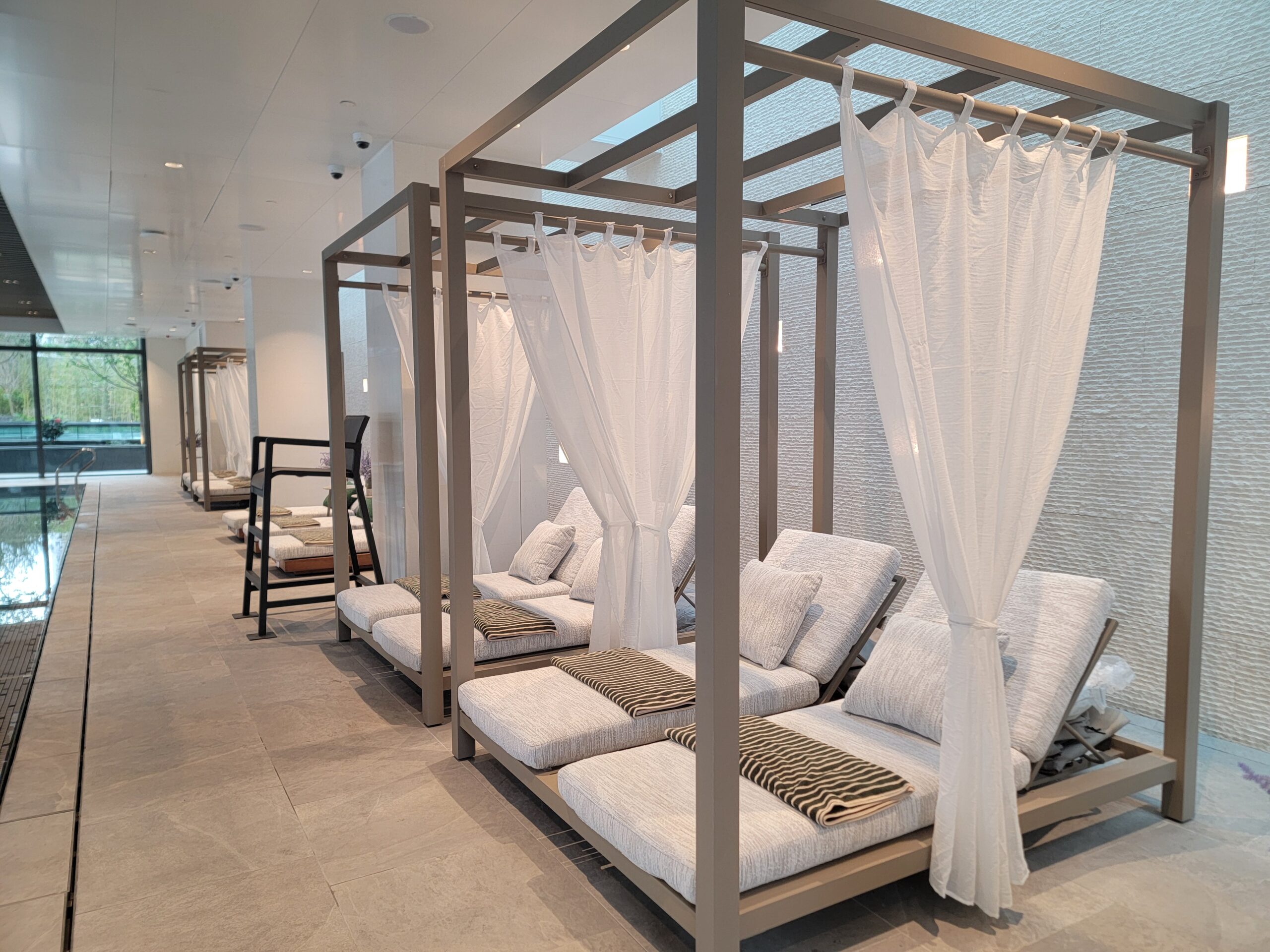 會所打造8大水主題設施,今日率先開放當中7個,包括全長約50米「The Kamo室外園林游泳池」、「Jacuzzi水力湧泉」、以噴泉水景,配合音樂及色彩投影營造精彩感官盛宴的「Lagoon光影動感覺池」、全長約22米「The Crystal室內琉璃星映池」及設趣緻噴水及玩樂裝置的「Kiddle兒童嬉水園」