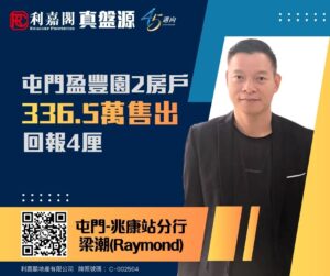利嘉閣地產屯門-兆康站分行助理分區經理梁潮(Raymond)稱,該行高級客戶經理羅玉蓮(Silvia)及屯門-珀御分行高級客戶經理羅素美(May)共同促成屯門盈豐園2座高層A室的二手成交個案,單位實用面積約390方呎,屬2房間隔,望開揚景。