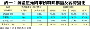 至於,九龍區21個指標屋苑於周末暫錄440組客戶預約睇樓,按周持平。利嘉閣地產新都城分行首席聯席董事鄧達榮表示,近日多區均有新盤推出,市場一手買賣成交活躍,但亦有部分向隅客回流至二手市場。他續指,區內上車客仍然以低價筍盤為目標,仍需時間接受樓價升幅;而區內換樓客則見樓價回升,相對積極睇樓趁早入市,料區內本周末預約睇樓量大致維持與上周末相若。
