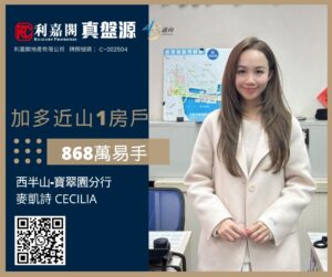 利嘉閣地產西半山-寶翠園分行分區董事黃祥湧(Keith)稱,該行高級客戶董事麥凱詩(Cecilia)新近促成堅尼地城加多近山高層C室的二手成交個案,單位實用面積約377方呎,採1房連開放式廚房間隔,望全海。