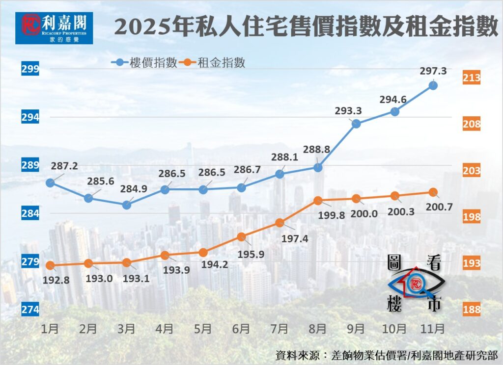 利嘉閣地產研究部主管陳海潮表示,樓價及租金雙雙持續走高,料2025年分別漲逾3%及4%,前者一洗之前3年頹勢,後者則延續上升銳勢。差估署今日公布的最新數據顯示,2025年11月份私人住宅售價指數報297.3點,較10月的294.6點再升0.92%,已是連續8個月呈平穩或上升,期間自3月份的谷底累積反彈4.35%,創近16個月高位,而單計連續6個月升勢亦累漲3.77%。今年首11個月累計,樓價累升2.80%,而與2021年9月的398.1點歷史高位比較,跌幅收窄至25.32%。
