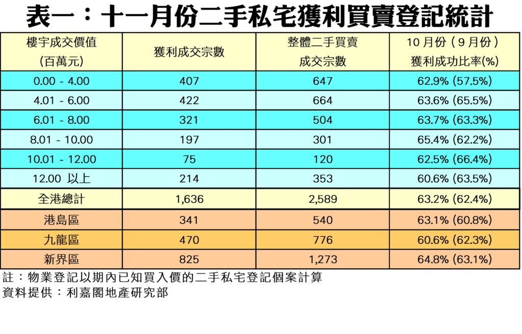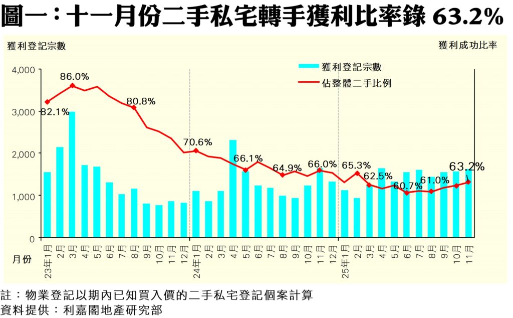 利嘉閣地產研究部主管陳海潮表示,隨著近月樓市價量齊升,二手市場的私宅轉手獲利比率亦持續改善,自低位出現3個月連升的佳況,反映整體樓市氣氛確有改善。綜合土地註冊處資料所得,2025年十一月份全港2,589宗已知上手購入價的二手私宅買賣登記中,帳面獲利個案共1,636宗,佔比63.2%,按月再升0.8個百分點,連升3個月,自八月低位累升2.2個百分點,並創下自三月以來的9個月新高。