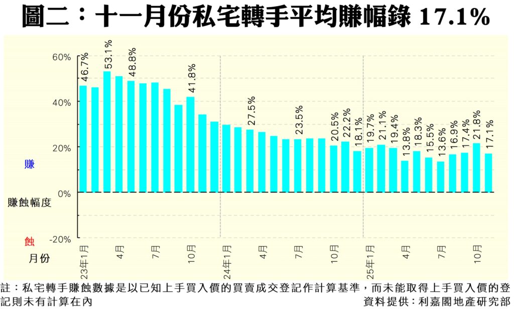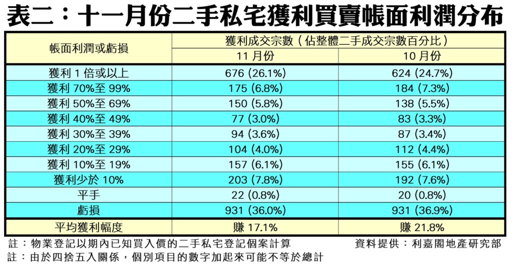 另外,數據顯示今年十一月份每宗私宅轉手個案平均賺幅再度回軟,錄得17.1%(見圖二),單月跌4.7個百分點,為連升三月後回落,但仍為近6個月以來的第3高。帳面獲利1倍或以上的轉手個案佔整體二手私宅買賣比例達26.1%,按月升1.4個百分點,錄676宗;至於帳面錄得虧損者有931宗,佔比按月跌0.9個百分點,至36.0%,為今年三月以來的9個月新低;至於上月平手的個案有22宗,佔比持平在0.8%。