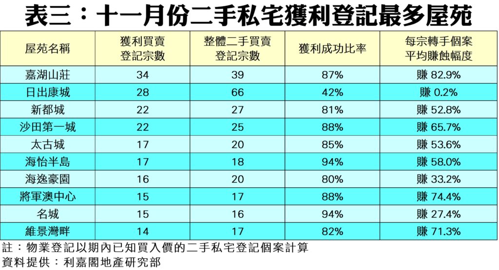 此外,檢視上月10個獲利登記最多的屋苑,當中未有屋苑能錄得百分百獲利,其中獲利成功比率最高者為海怡半島,錄得94.4%,其次為名城的93.8%,而第三為將軍澳中心的88.2%。此10個屋苑當中,每宗平均賺蝕幅度介乎最少的賺0.2%至最佳的賺82.9%不等。其中,嘉湖山莊錄得每宗轉手平均賺82.9%,為表現最好的屋苑;至於將軍澳中心及維景灣畔也分別平均賺74.4%%及71.3%。不過,日出康城表現相對遜色,平均每宗轉手只微賺0.2%(見表三)。