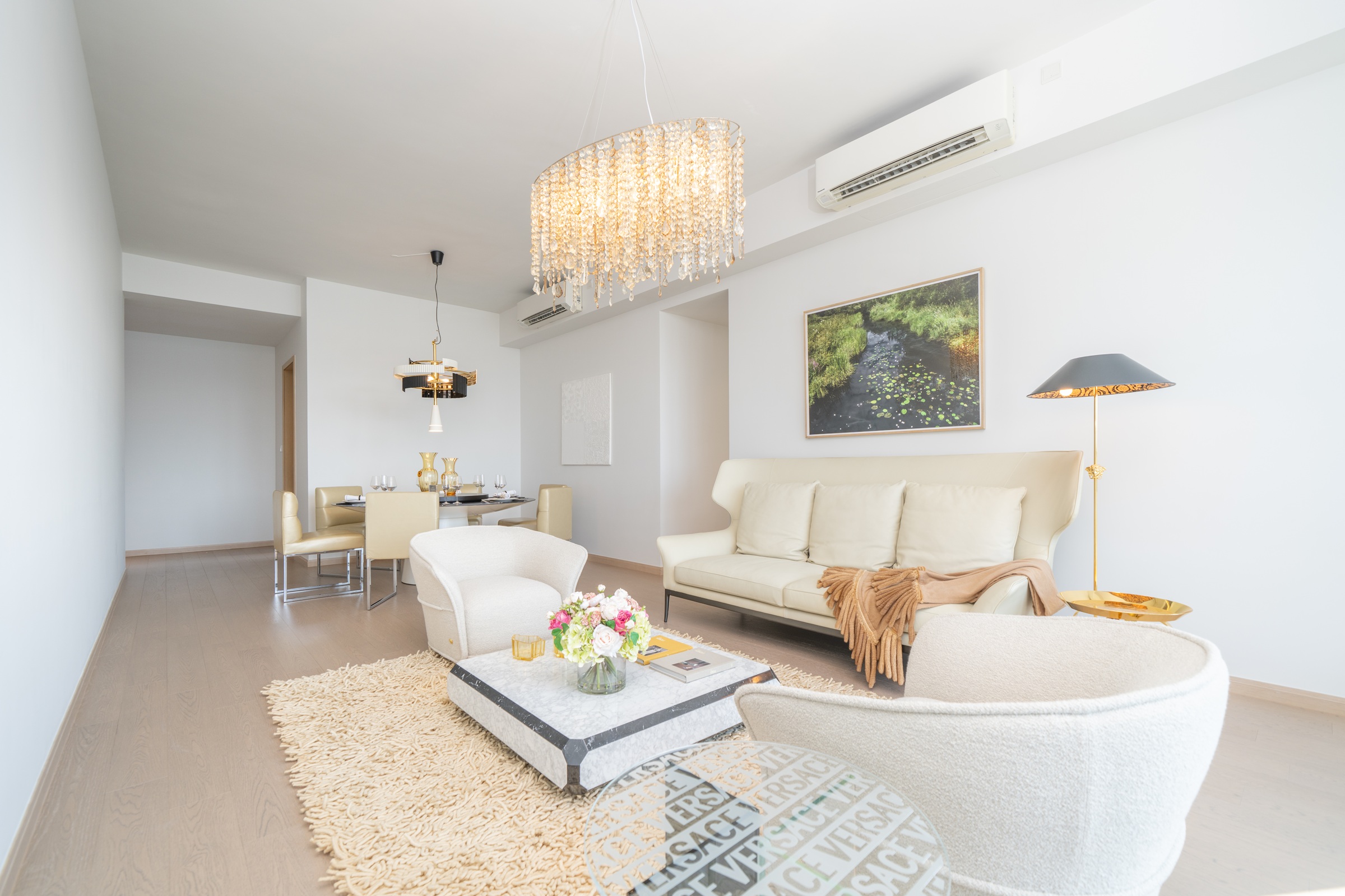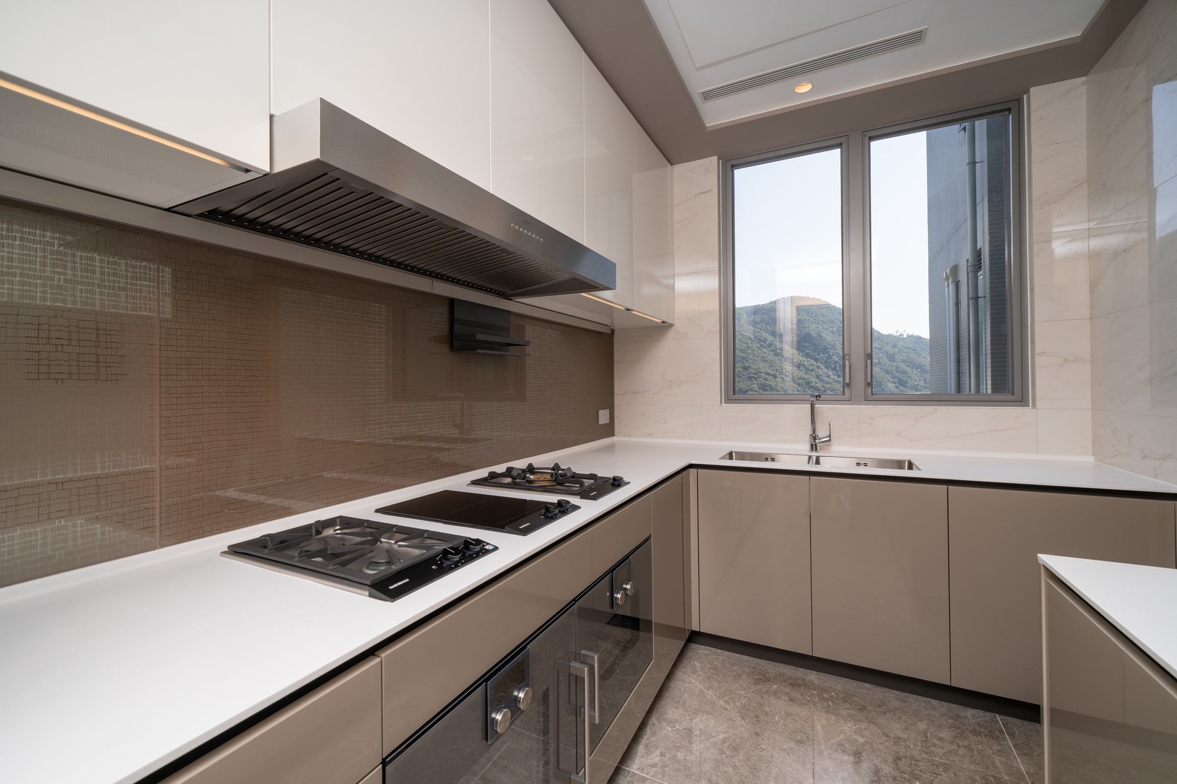 廚房空間四正,採用意大利品牌Poliform廚櫃,糅合美學與實用,廚房備有各款名牌家電,包括德國頂級廚具品牌GAGGENAU的特大雙門雪櫃、蒸焗爐、電磁爐、咖啡機、洗衣機、乾衣機,以及抽油煙機。另外,單位內展示由「LOUVRE GALLERY」挑選的多款家具及燈飾,包括意大利品牌Versace Home的大型梳化、座地燈、角几及玻璃飾品,以及同屬意大利品牌Fendi Casa的餐椅。