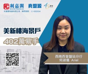 凌氏表示,新買家為外區客,早前經利嘉閣真盤源平台搵樓,見上述放盤即約代理睇樓。客人心儀單位景觀開揚,望優美維港海景,間隔合用,加上屋苑地理位置優越,附近民生配套齊全,睇樓後即向業主洽購,終以402萬元合理價成交,折合實用面積呎價約10,836元。
