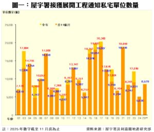 此外,私人住宅落成量方面,根據屋宇署今日最新發表的資料月報顯示,十一月份全港共有3個項目,合共383個私人住宅單位落成(以屋宇署發出佔用許可證的樓宇數量為準),較十月份的3,820伙急挫九成,亦為年內按月次少;至於2025年首11個月累計共17,558伙私宅落成,較2024年同期的18,679伙微跌6%。