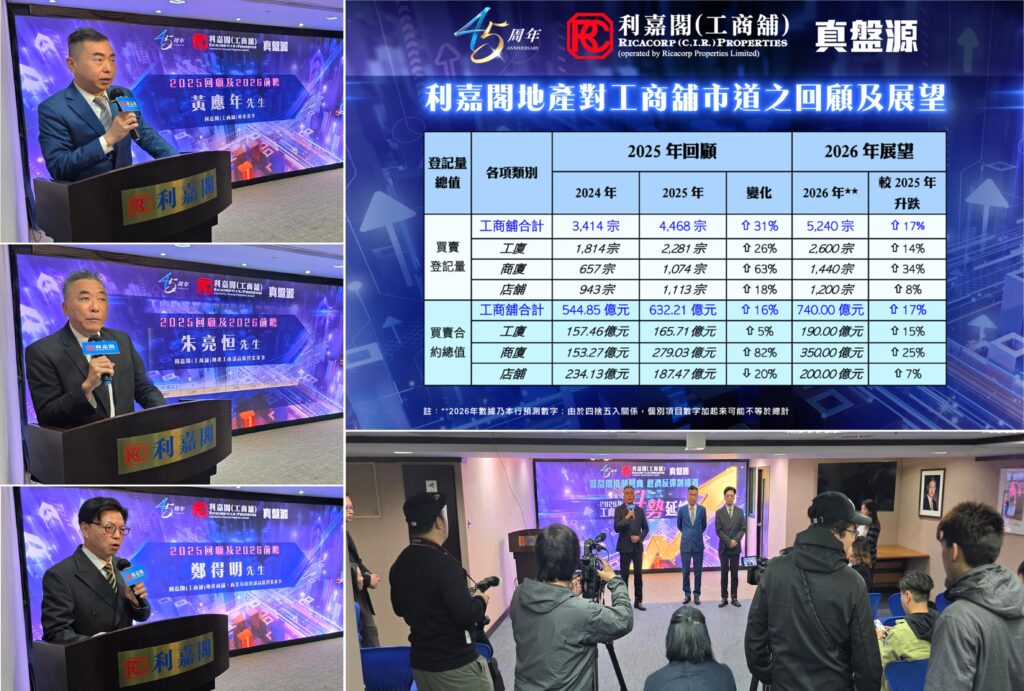 展望2026年走勢,黃應年相信,工商舖市道在過去兩年已先後觸底及成功反彈,即最低迷時期已過,今年將徐徐回暖,主要看好息口仍有下調空間,而股市及經濟回升的財富效應可延伸至工商舖物業,刺激交投進一步上升;當中工廈及店舖買賣登記量分別看升14%及8%,上試2,600宗及1,200宗水平;而商廈更料漲34%,挑戰1,440宗水平。綜合上述利好因素,初步預計2026年全年整體工商舖買賣登記宗數可望再升17%,上試5,240宗水平,進一步試闖5年新高;至於涉及的買賣登記金額料按年增加近17%,上試740億元的4年高位。