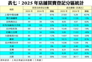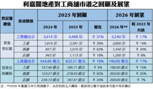 鄭得明續指,縱然店舖領域仍處盤整階段,亦隱含升級機會,意味當前租金合理,為體驗式消費、健康生活及創新概念店提供理想入場門檻。業主則可借勢革新租務布局,融入文化娛樂與生活方式元素,提升街區及商場的整體魅力,從而帶動客流回暖及銷售額穩步攀升。鄭氏看好2026年店舖市道可持續回勇,預期全年店舖買賣登記量可進一步升至1,200宗水平,漲幅約8%,而涉及登記總值料上試200億元,年增約7%。