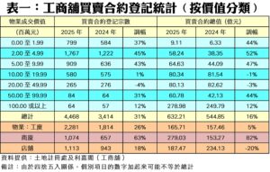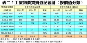 以價格組別劃分,2025年介乎200萬元至500萬元以內價格組別的工廈成交量維持最多,錄得1,070宗登記,按年大增34%;次多的500萬至1,000萬元以內組別有464宗買賣,按年更升41% (見附錄表二)。去年七個價格組別的工廈買賣宗數錄得三升四跌,其中以200萬元以內工廈升幅最大,去年共錄408宗,急漲49%,反映升幅集中在中細價工廈。至於逆市下跌較多者為2,000萬至5,000萬元以內組別的工廈,按年只錄59宗,同比挫23%。