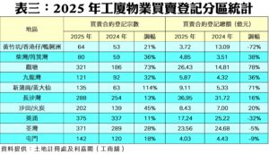 2025年全年累計,工廈買賣登記共錄得2,281宗,較2024年度破天荒的1,814宗歷史低位回升26%,涉及買賣合約總值則微升5%,至165.71億元;宗數為連跌3年後反彈,並創近3年高位。去年工廈買賣登記量在首季表現不俗,錄約588宗,次季更增至全年最旺的644宗;不過第三季略為回氣,降至516宗,而第四季受惠減息及經濟好轉,按季回升至533宗,市況再度回暖。