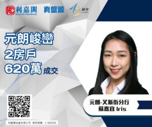 利嘉閣地產元朗-又新街分行高級分區董事陳庭豐(Frankie)表示,該行客戶經理蘇嘉宜(Iris)最新促成元朗峻巒2B期PARK YOHO Napoli 25B座低層A室的二手成交個案,單位實用面積約581方呎,屬2房連士多房間隔,望開揚山景。