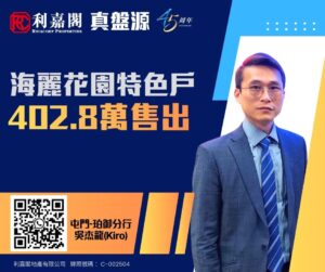 利嘉閣地產屯門-珀御分行高級經理陳志偉(Joe)稱,該行物業顧問吳杰龍(Kiro)最新促成屯門海麗花園1座一個高層連天台特色戶的二手成交個案,單位實用面積約452方呎,連天台297方呎,屬2房間隔,望開揚景觀。