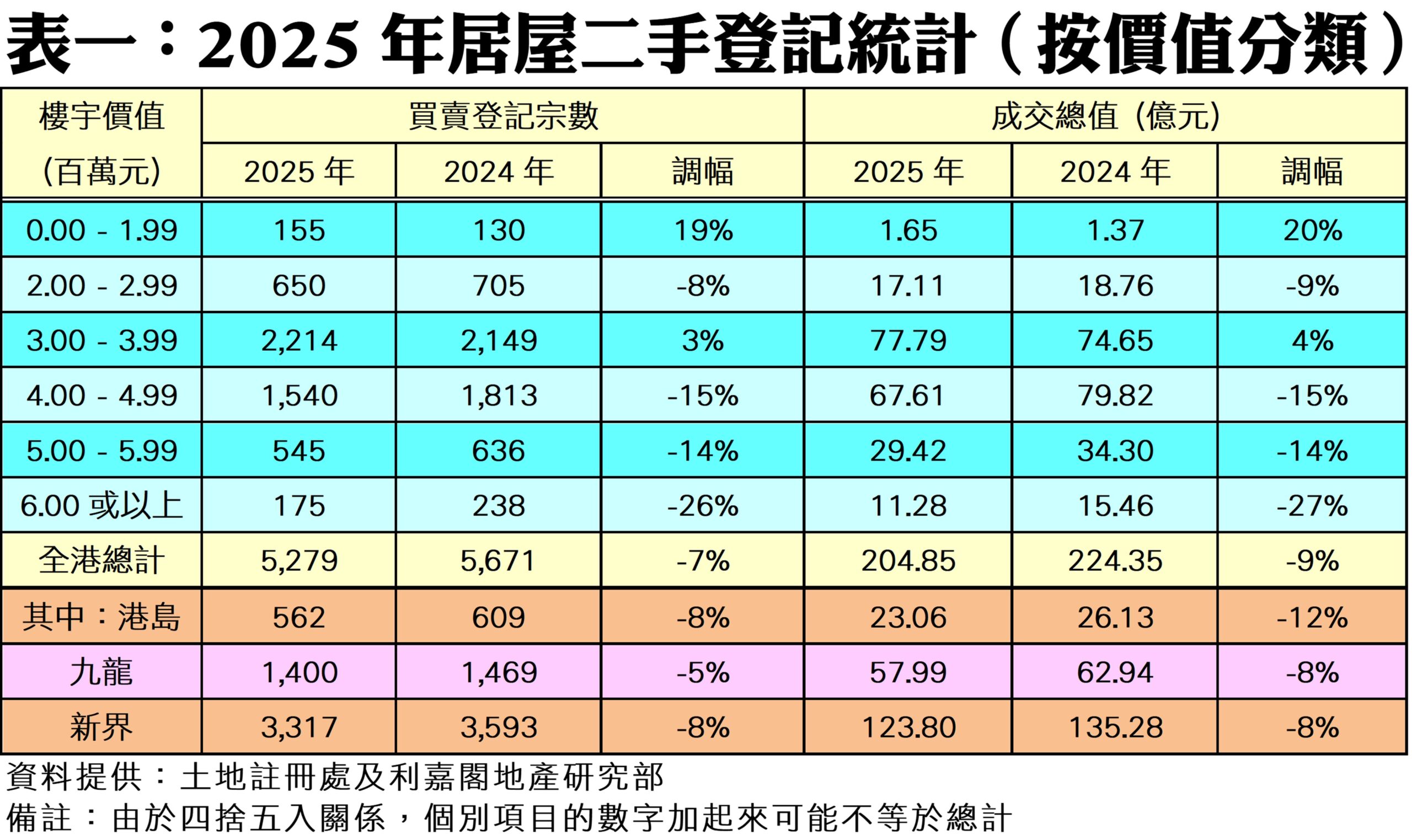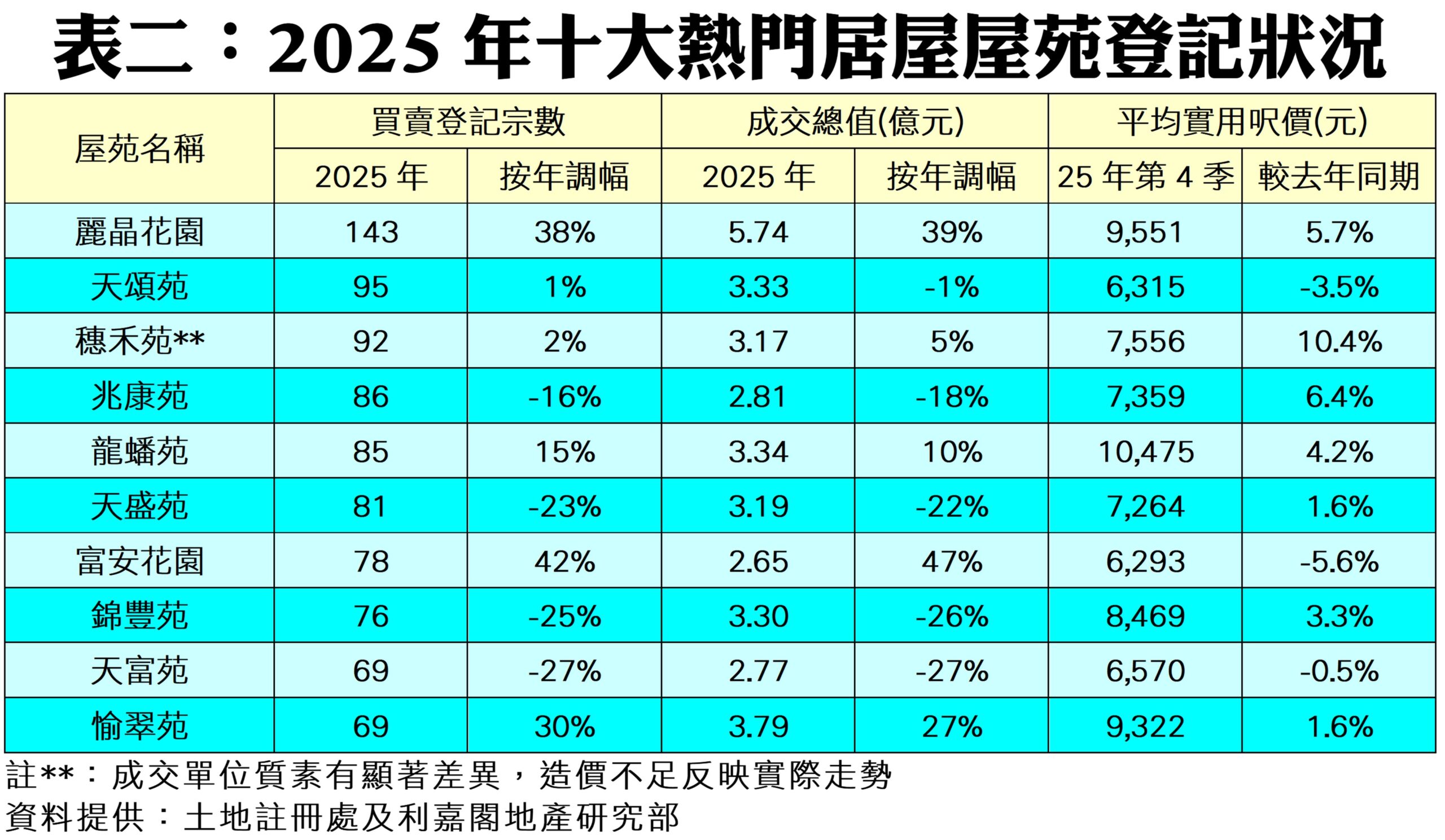 按樓價作分析(見表一),6個價格分類交投量按年錄得4跌2升,其中價值600萬元或以上的組別跌幅顯著,成交宗數按年大減兩成半至175宗;而登記量最多的組別則為價值300萬元至400萬元以內的二手居屋單位,2025年共錄2,214宗,按年增加3%。如以地區劃分,港島及新界兩區均錄得近8%的按年跌幅,分別至562宗及3,317宗二手居屋登記;九龍區亦減少約5%至1,400宗。如按屋苑細分(見表二),2025年以九龍灣麗晶花園的成交登記量最多,共錄得143宗買賣,較2024年的104宗增加38%;至於上述屋苑期內成交總值約為5.74億元,按年升約39%。另外,天水圍天頌苑則以95宗登記成為亞軍,成交總值錄3.33億元。