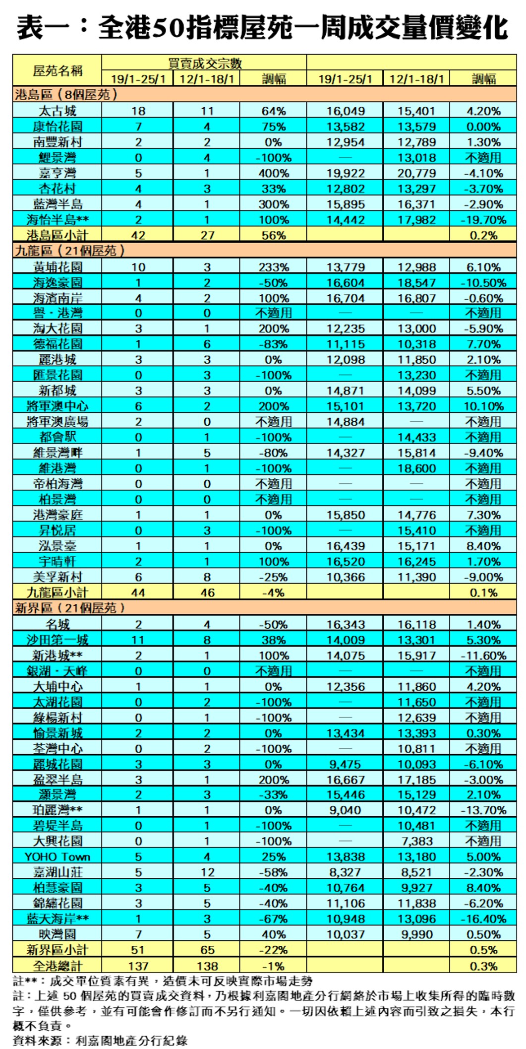 至於,港島區8個指標屋苑上周共錄42宗買賣,較前周的27宗增加56%,其中嘉亨灣交投量由前周的1宗,大增4倍至上周的5宗;藍灣半島及海怡半島各錄4宗及2宗成交,分別按周增加3倍及1倍;太古城康怡花園各錄18宗及7宗交投,分別按周增加64%及75%。此外,在全港50個指標屋苑之中,上周共有14個屋苑錄得「零成交」,較前周的5個增加1.8倍,當中九龍區及新界區分別佔7個及6個屋苑,港島區則佔1個(詳見表一)。