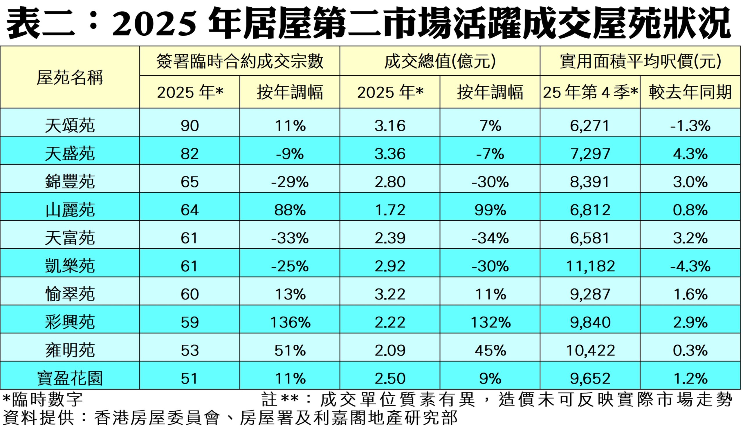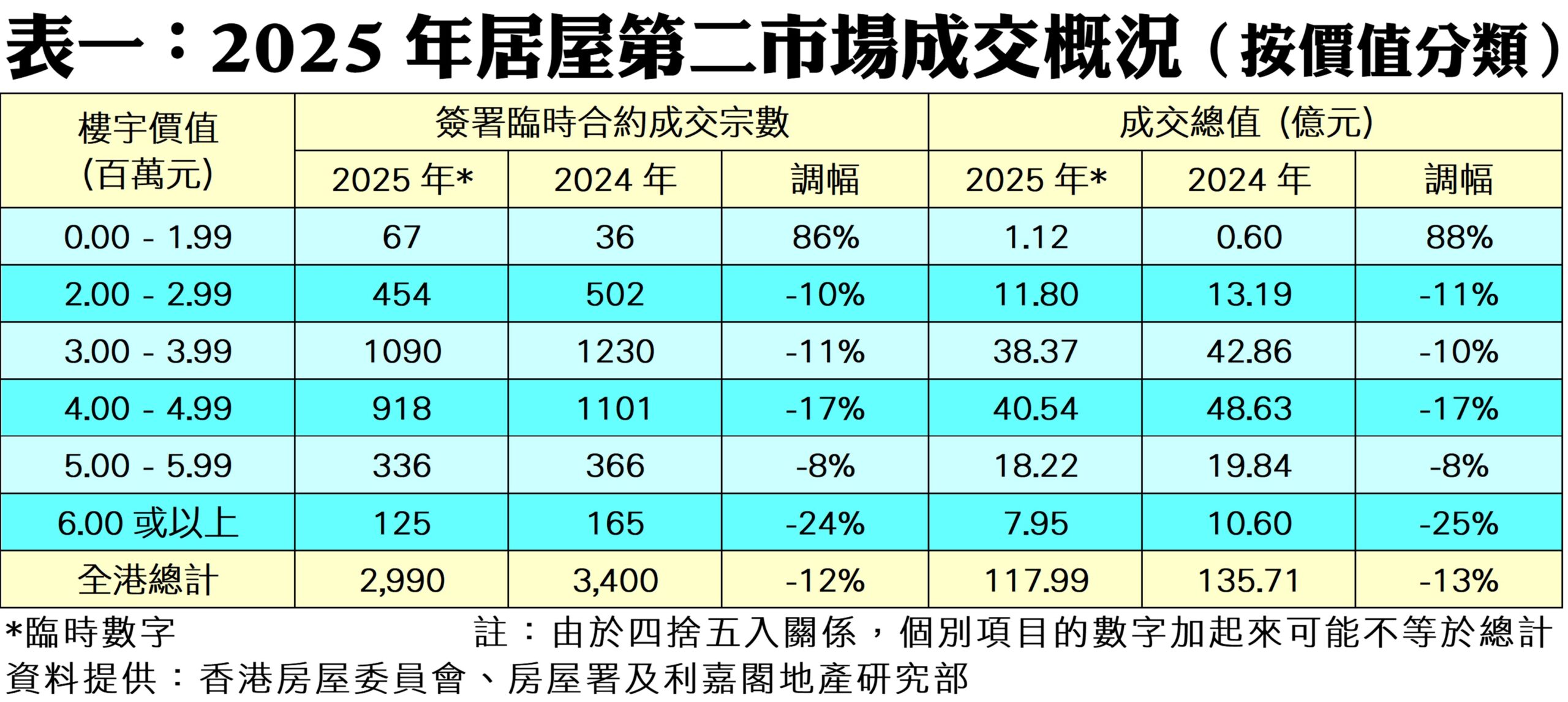 利嘉閣地產研究部主管陳海潮表示,去年本港樓市回穩升溫,成交量值在$100印花稅放寬後穩步上升。而「居二」市場則在10月批證後迎來一個小爆發,在自2024年5月以來,未補價居屋買賣登記量重破400宗大關,分別在10月及11月勁錄419宗及525宗。根據香港房屋委員會及房屋署網頁最新數據,綜觀2025年全年,全港錄得2,990宗居屋第二市場買賣個案(按簽署臨時買賣合約的成交為準),較2024年的3,400宗跌約一成二;居二市場買賣大跌12%主因是前年公屋富戶政策所帶來的高基數所致,但按年仍然保持千禧年至今次高紀錄。而同期物業成交總值錄約177.99億元,按年跌約一成三,但已連續五年維持逾百億的居二成交總額。