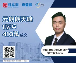 利嘉閣地產元朗-朗屏8號A組分行高級聯席董事吳紫旭(Yoyo)表示,該行高級客戶經理章立賢(Kevin)最新促成元朗朗天峰2座高層H室的二手成交個案,單位實用面積約291方呎,屬1房連開放式廚房間隔,外望開揚景觀。