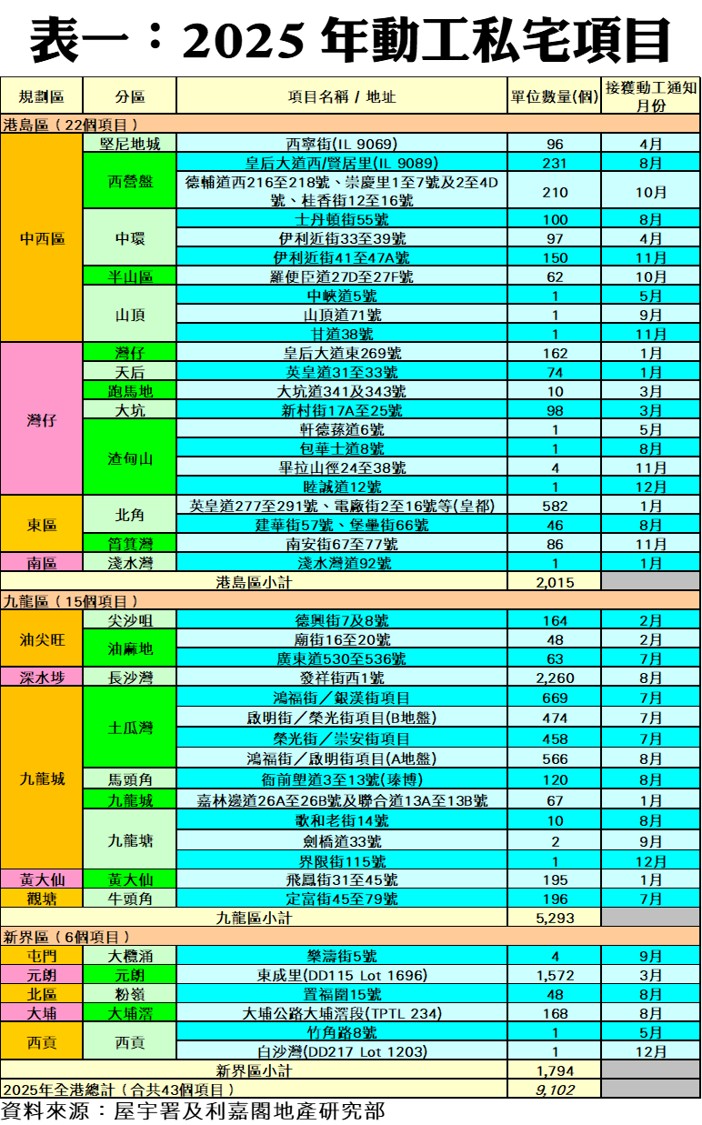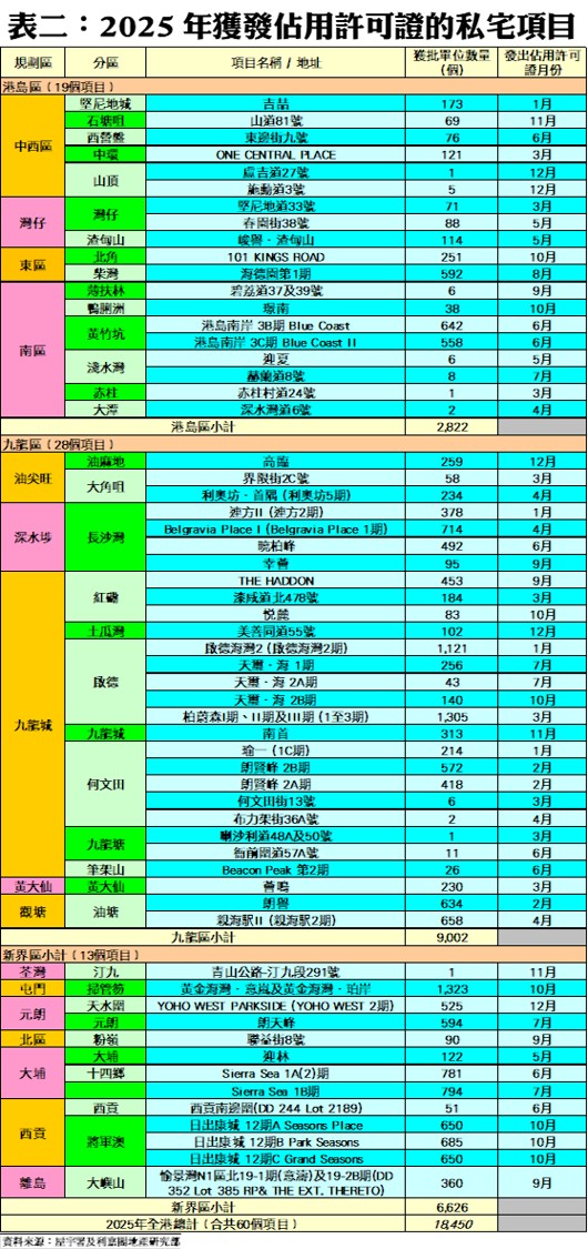 按地區劃分,2025年全年九龍區共有28個項目、合共9,002個單位落成,佔整體比例約48.8%;新界區共有13個項目落成,涉及單位總數6,626伙,佔整體私宅落成量約35.9%;港島區則有19個項目落成,涉及2,822伙,佔整體私宅落成量約15.3%。