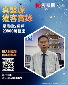 利嘉閣地產嘉亨灣及杏花區助理營業董事劉信文(Raymond)稱,嘉亨灣1行高級客戶經理黃志華(Johnny)近日促成西灣河星灣峰高層C室的二手租賃成交個案,單位實用面積約432方呎,採2房間隔,外望開揚景觀。