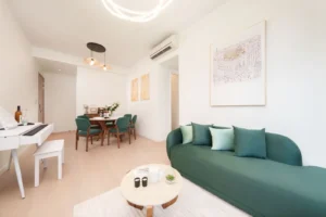 上述示範單位將連同所展示裝修及傢俬出售,設計以優雅中性的綠色作主調,營造出靜謐悠閒的度假氛圍。單位整體布局流暢實用,空間運用極致靈活,更配備德國頂級品牌SIEMENS家電及爐具,盡顯時尚生活格調。