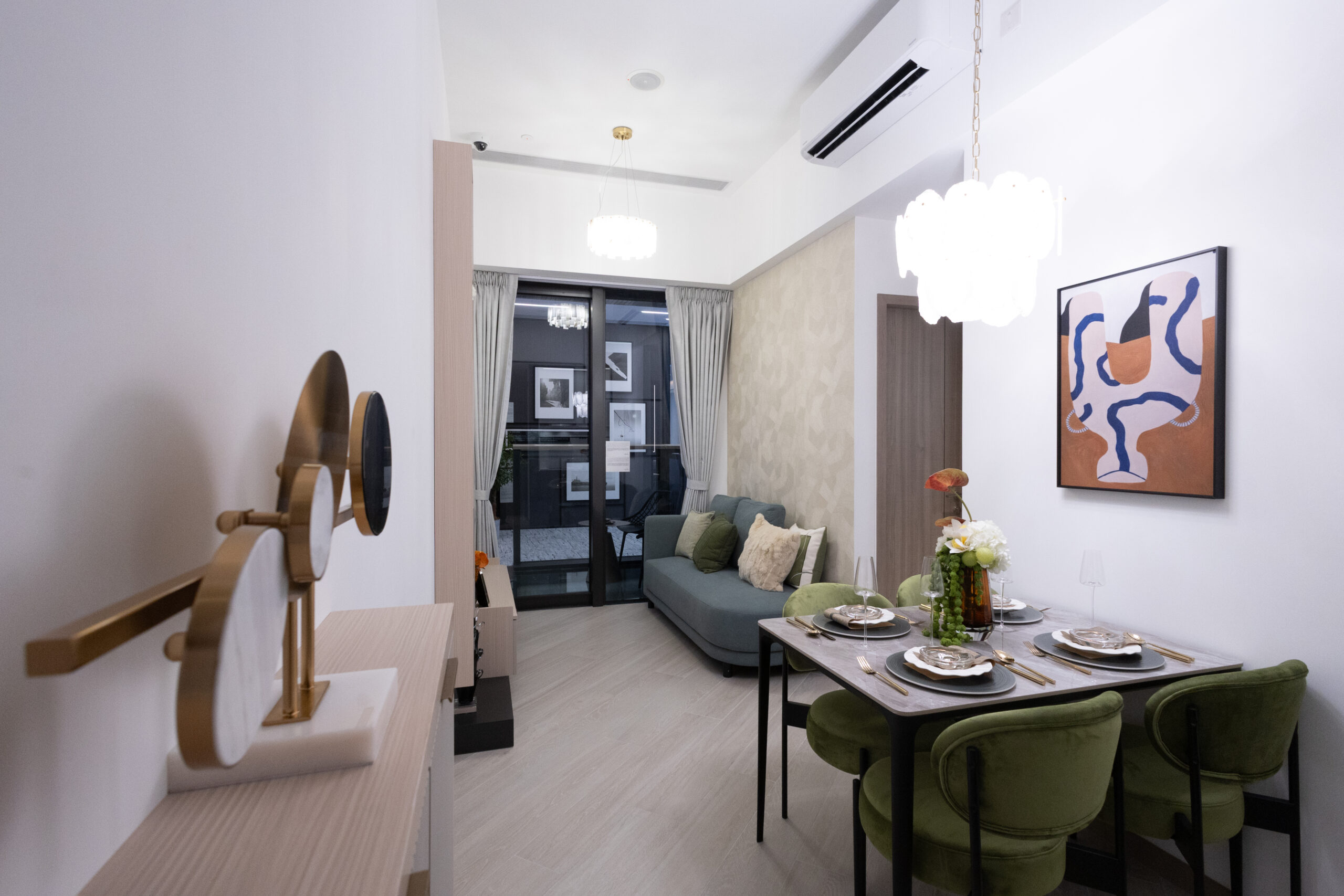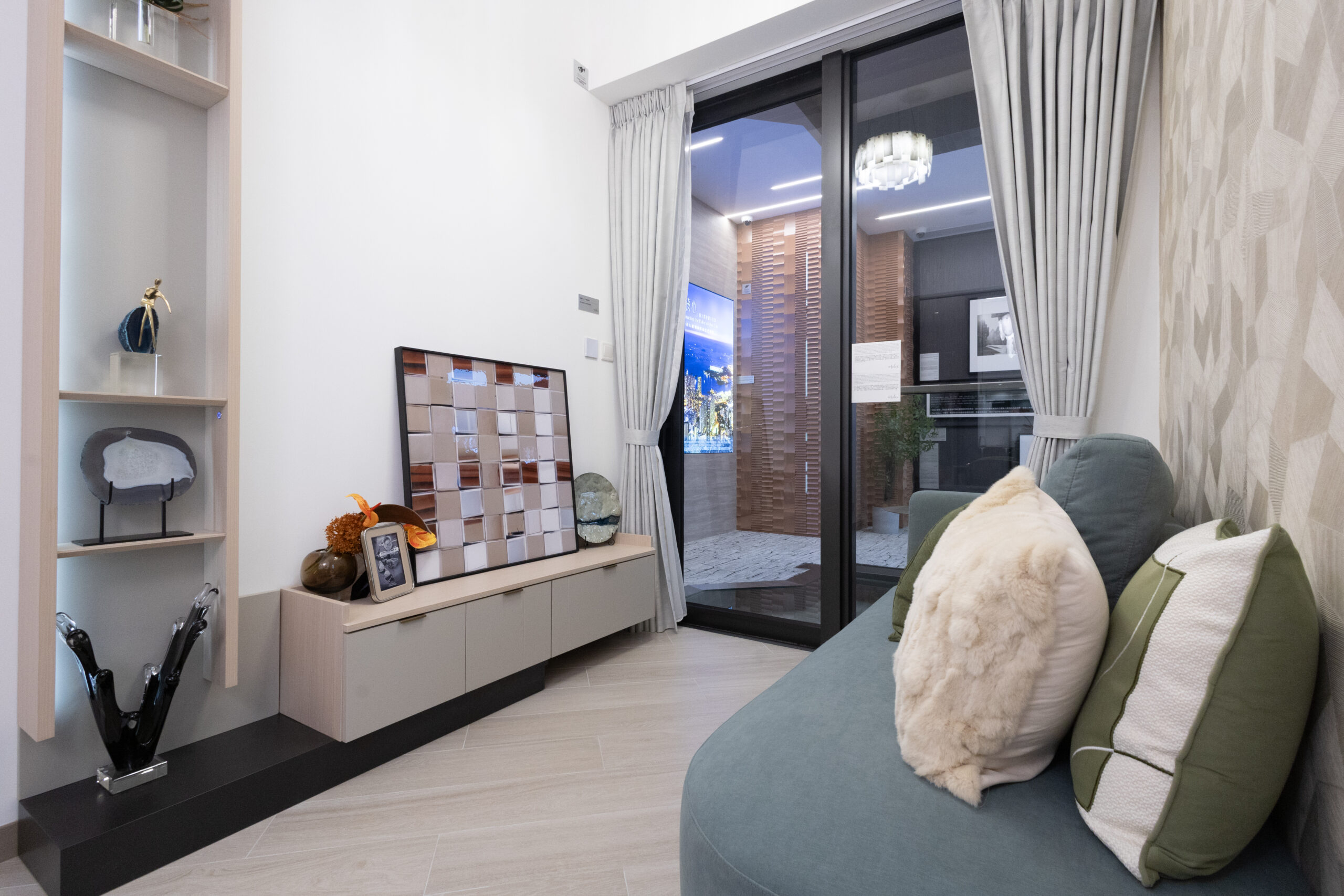 單位總長度約6.5米,客飯廳布局分明,方便擺放各種家具。大型玻璃趟門連接實用面積約38方呎的特大三合一露台及工作平台,延伸室內外空間,住戶可放置戶外家具,打造成私人茶座。此外,露台及工作平台亦設有晾衣裝置,有效運用單位每一吋空間。全屋更鋪設德國標準防滑地磚,美觀耐用同時又可提升家居安全。