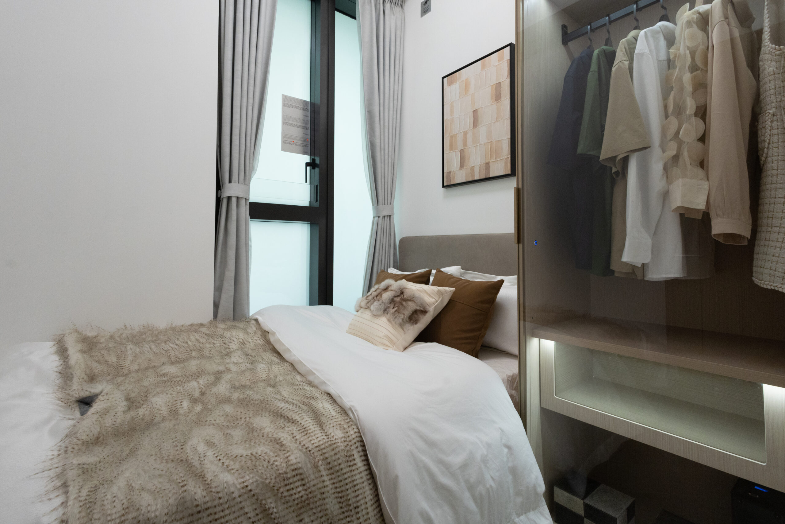 該示範單位參照18樓A室為藍本搭建,屬睡房連書房間隔,實用面積347方呎,特高樓底層與層之間高達3.5米,配以落地玻璃趟門,引進自然光,一室光潔明亮,空間感十足。