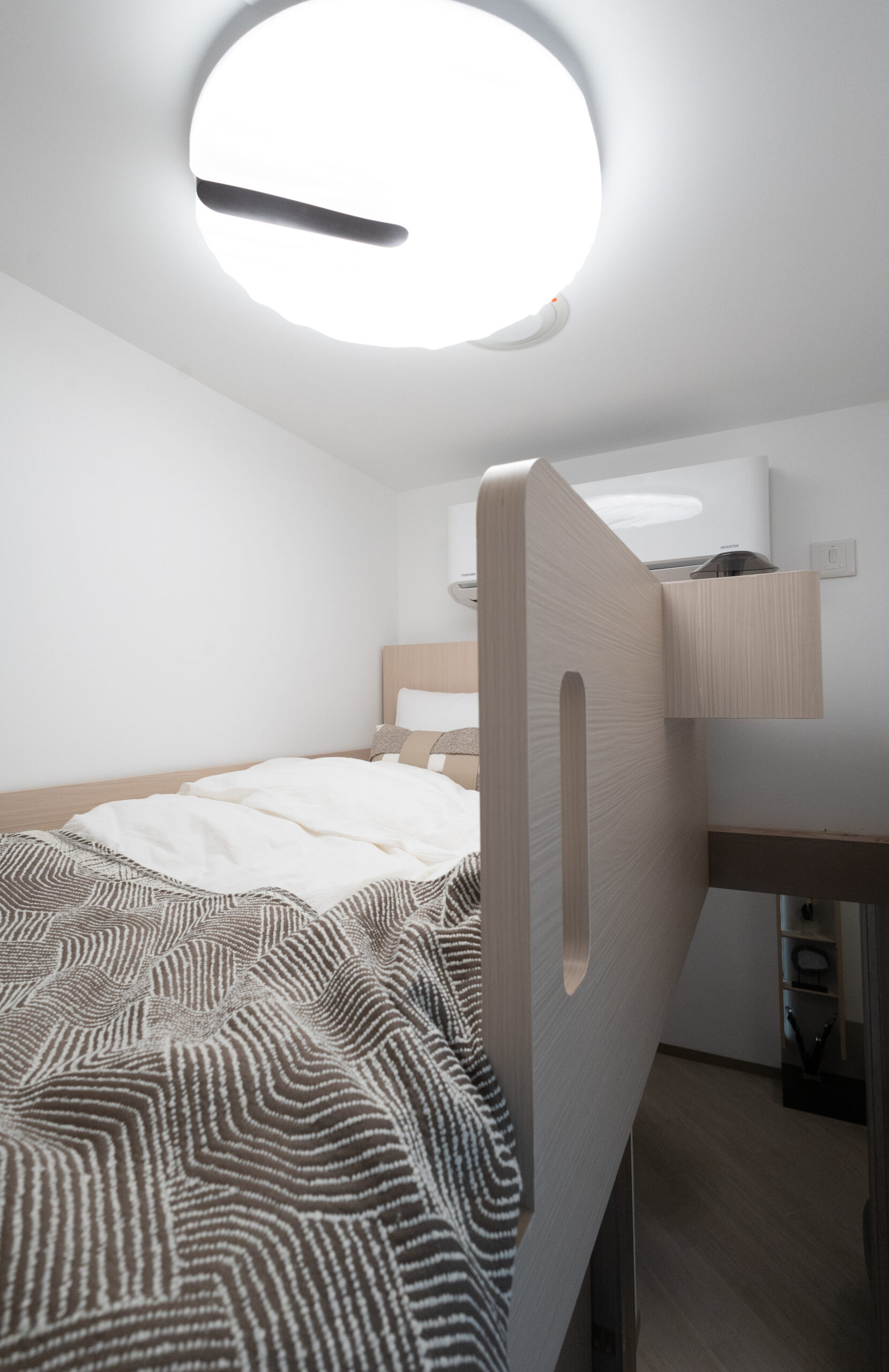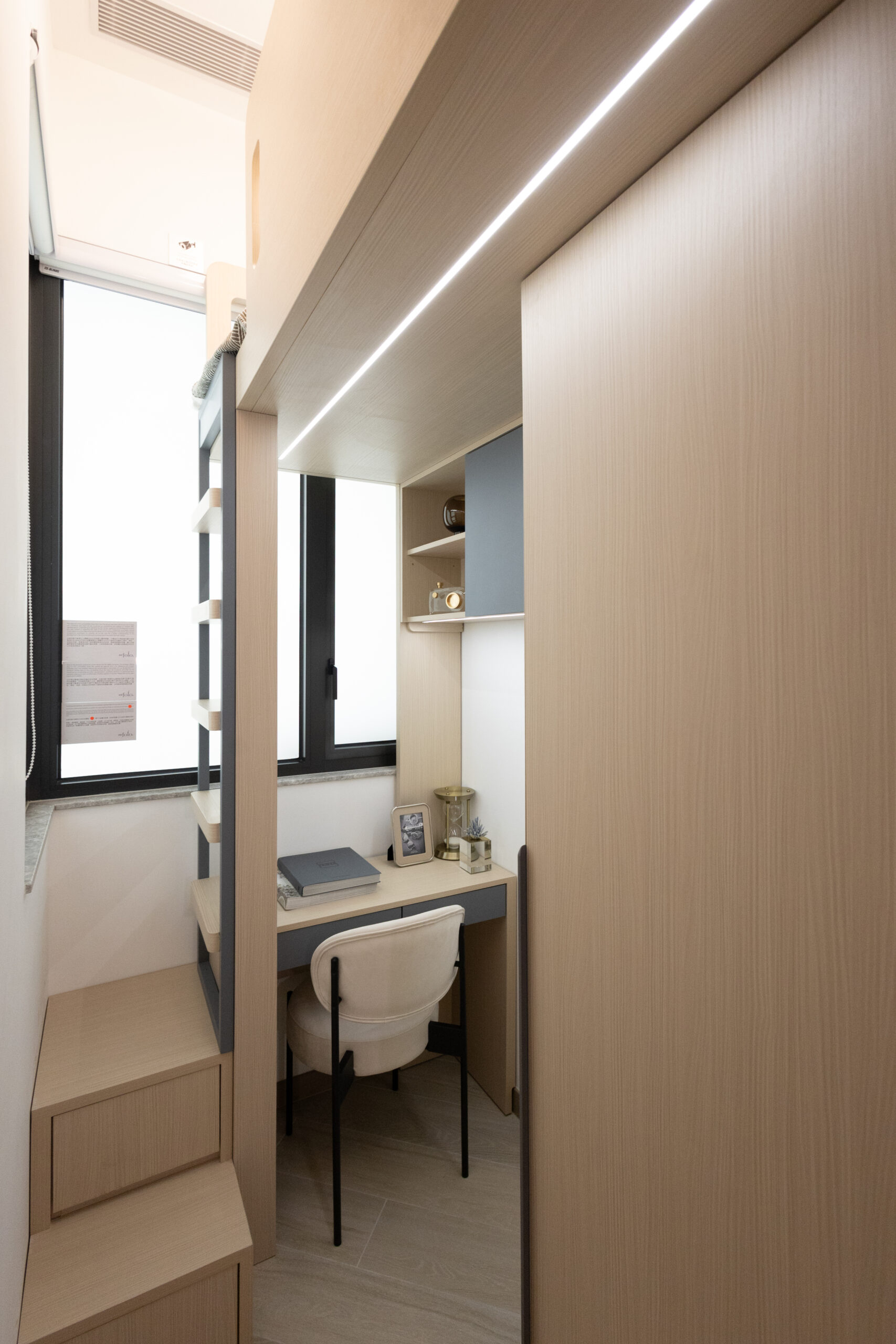 睡房空間寬敞,足夠擺放雙人睡床及衣櫃,與客飯廳同向。書房巧妙利用3.5米特高樓底的優勢,打造為「輕奢空間」,下層設有書桌閱讀區域,利用儲物收納式梯級連接上層寧靜的睡眠區,為住戶創造功能性以及舒適度兼備的空間。