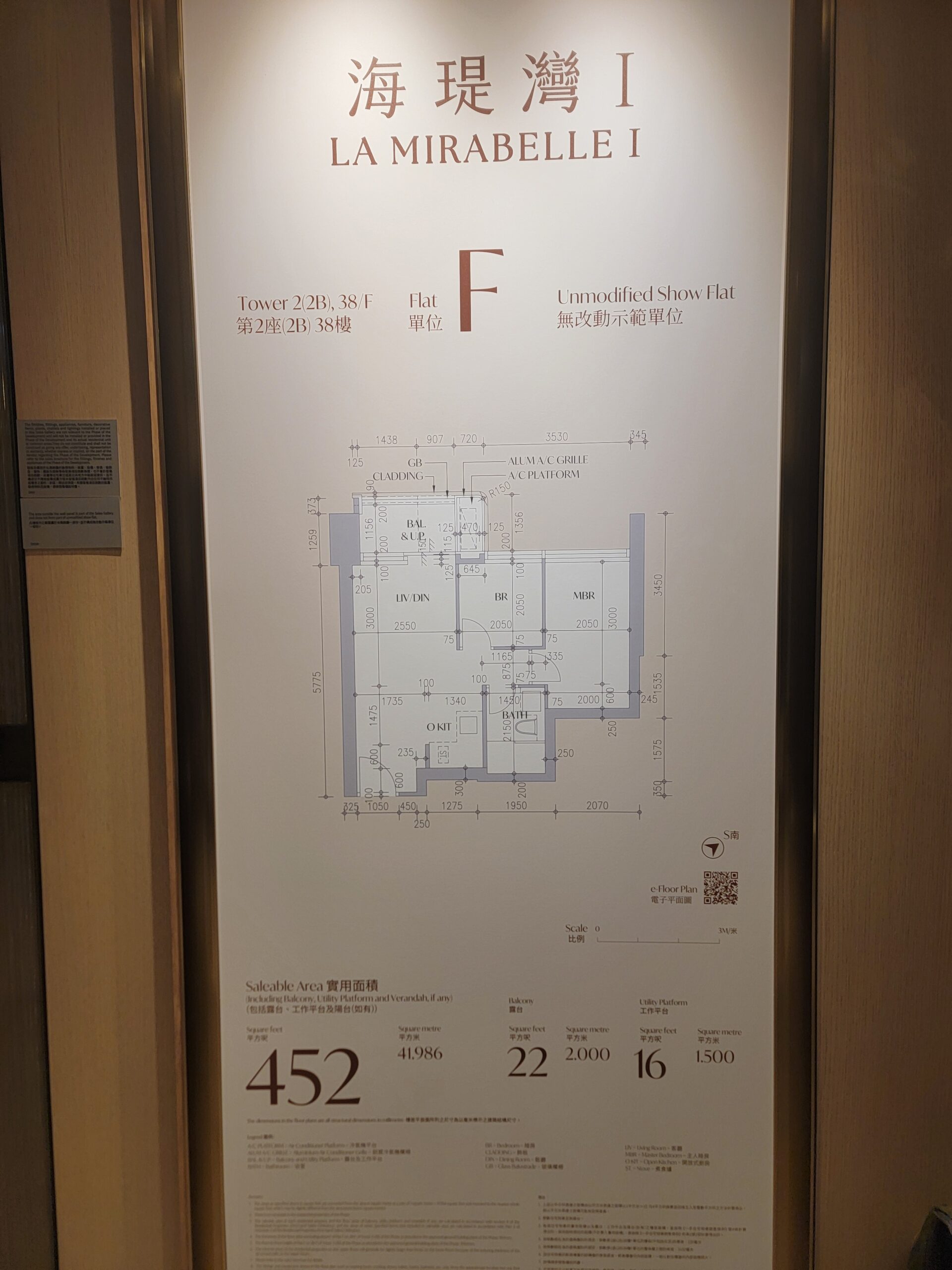 單位以第2座 (2B) 38樓F單位為藍本搭建,實用面積452方呎,間隔為兩房連開放式廚房,連實用面積38方呎露台及工作平台。單位門口附設一組鞋櫃,設計方便貼心。客飯廳長形開則,容易布局,並與露台相連,可採納室外自然光線,營造明亮舒適感覺。