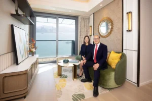 中國海外地產董事總經理游偉光表示,「維港.灣畔」昨日(24日)已上載第 2B 期御海門售樓說明書。今日開放項目全新海景現樓單位予傳媒參觀,包括1伙裝修住宅單位及1伙無改動住宅單位,均為三房間隔。現介紹豪華裝修單位,為第5B座17樓A室,實用面積744方呎,屬三房一套加工作間及洗手間間隔,客飯廳與所有睡房同享港島東至中環維港兩岸景致。