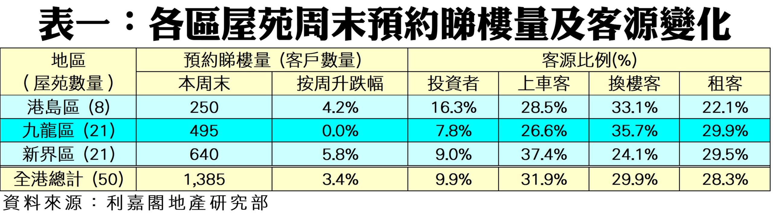 利嘉閣地產研究部主管陳海潮表示,官方樓價指數連升九個月,反映樓市旺勢持續,普遍買家見樓價越升越有,擺脫觀望心態,積極搵盤入市,帶動周末預約睇樓量回升。根據利嘉閣地產研究部數據估算,全港50個指標屋苑共錄1,385組客戶於周末預約睇樓,較上周末的1,340組升3.4%。