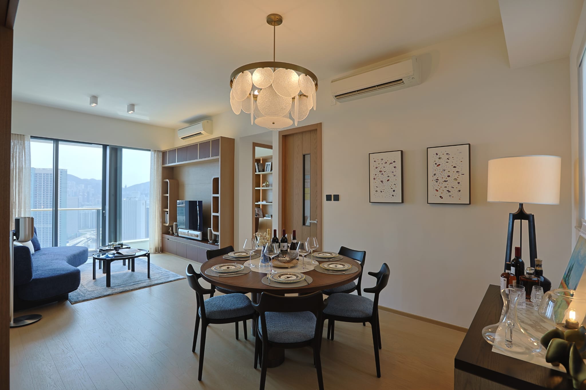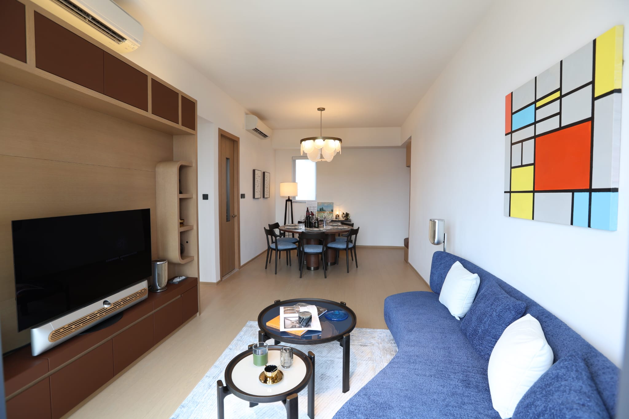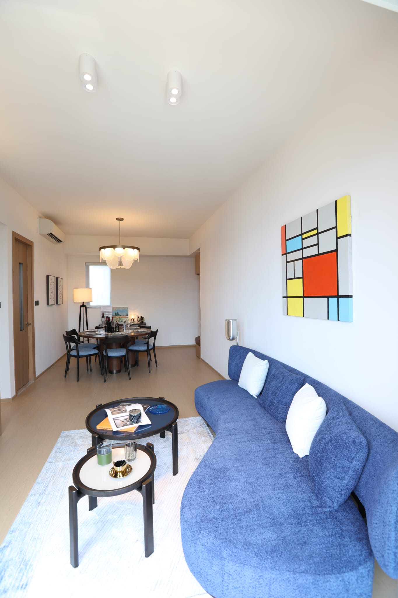 客廳以海藍色為主調,搭配精心挑選的現代傢俱與裝飾掛畫,營造出時尚和寧靜的氛圍。海藍色的弧形沙發,搭配如煙花般綻放的藍色線條地毯、與一大一小的高光木質咖啡桌與邊桌,為空間增添材質層次,既具視覺亮點,亦 兼顧日常使用的實用性;電視櫃同樣以異材質呈現,深色木材與皮革搭配, 質感高雅而沉穩,不僅提升了客廳的視覺層次,也提供多個讓住戶展示「心頭好」的空間;飯廳的六人圓形餐桌,以胡桃木配襯白色大理石紋石,並配備轉盤功能,兼具美感與實用性。黑木色的支架及藍色面料的餐椅同時呼應餐桌的胡桃木色 及客廳海藍色的主調,營造高雅舒適的用餐氛圍。