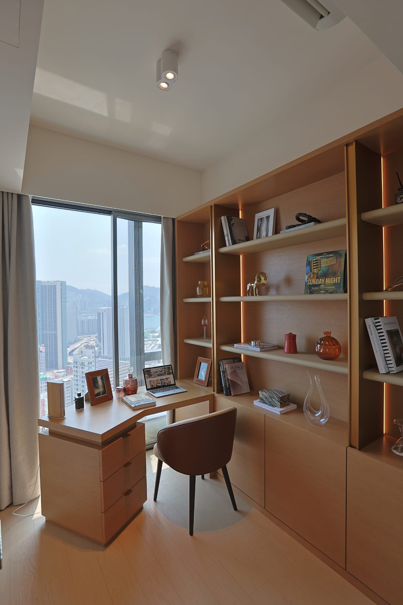 書房以木系為主調,營造寧靜安逸的氛圍,書桌旁展示櫃兼具收納與展示功 能,設計師更在櫃內加入隱藏式LED燈條,營造柔和光影,皮革層架則在細 節中展現低調奢華,讓住戶專注工作。
