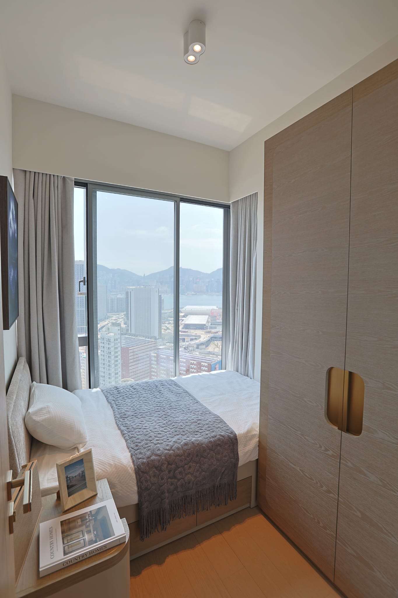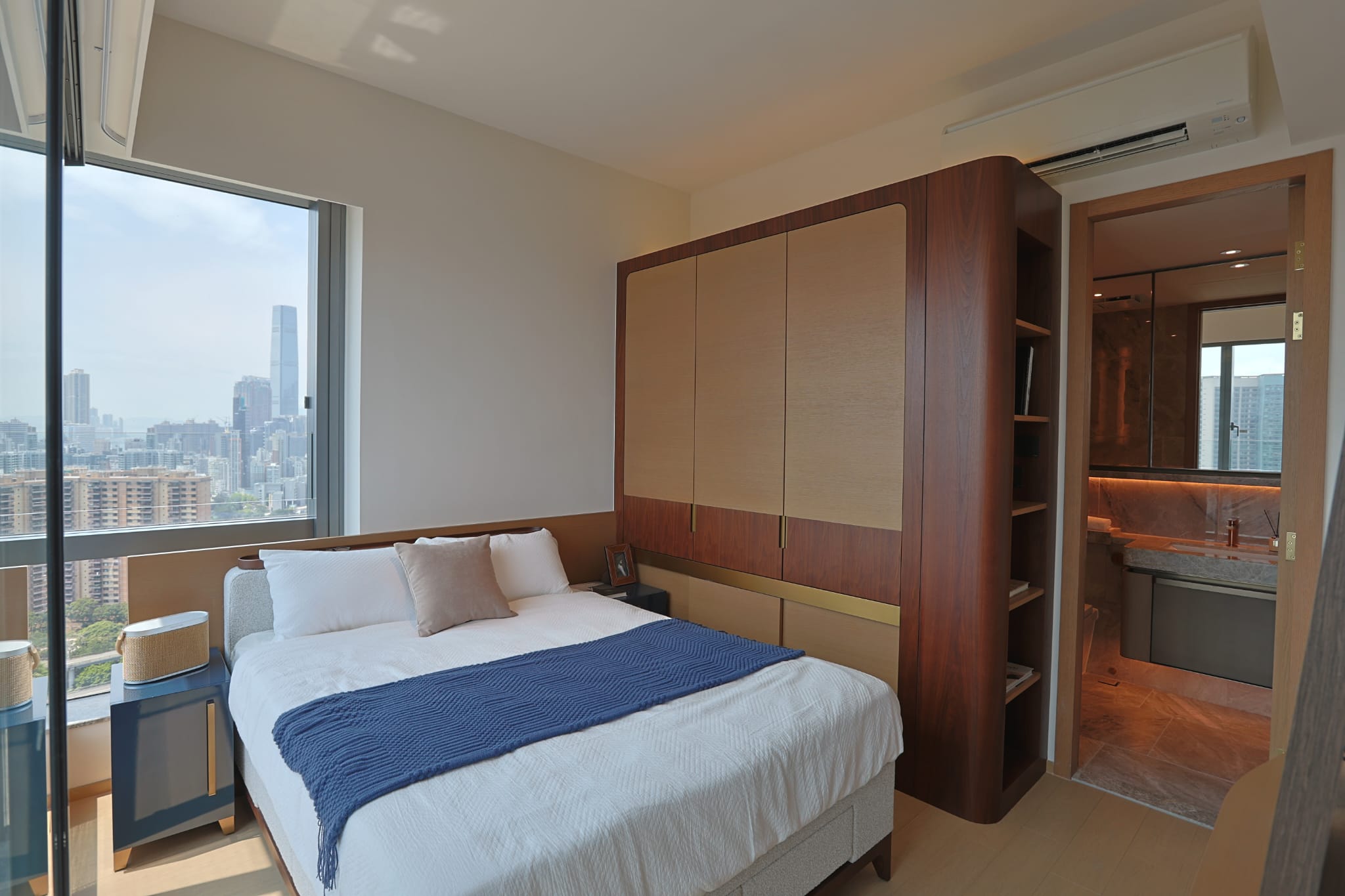 主人套房及睡房主人套房及2間睡房與客廳同向,特大窗戶有利採光,更可以輕鬆欣賞到醉人維港景色;主人套房設有廣角玻璃窗,並外接約16方呎工作平台,在市區中可以同時欣賞維港景觀、東九龍優美海岸及西九龍海景等三邊海景;主人套房空間感十足,並融合了現代感和奢華舒適感。擺放大床後,兩旁仍 然可以放置床頭櫃及三邊落床。另一邊設有特高深啡色拼淺木色衣櫃,精緻金屬把手和內置感應燈光,不僅提供充裕的收納空間,也展現住戶的時尚品 味。房間內的放置了以綻放中的煙花主題掛畫,呼應單位維港煙花盛景設計 靈感的主題。另一間睡房以中性色調結合淺色系木紋傢俱,營造一個溫馨和寧靜的私人空 間;睡房設有衣櫃,雅緻實用,提供了充足的儲物空間。
