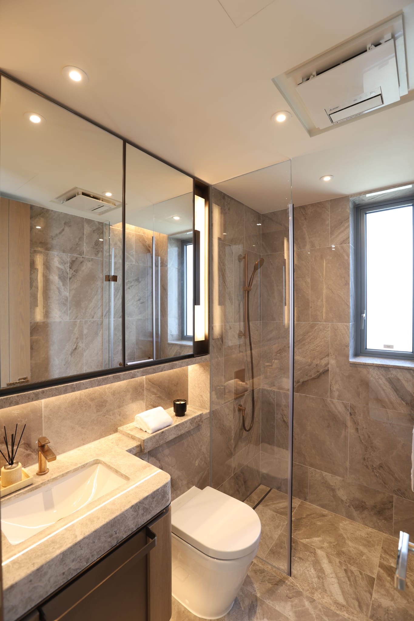 主人浴室及浴室均採用明廁設計,嚴選仿雲石紋理瓷磚打造牆身及地台,配備一系列國際品牌浴室設備,如德國品牌Villeroy & Boch座廁和洗手盆,以 及意大利品牌Gessi洗手盆水龍頭和花灑套裝;主人浴室別具氣派,設有淋浴間及配備德國品牌Bette浴缸,讓戶主享有更優 質的私人空間。