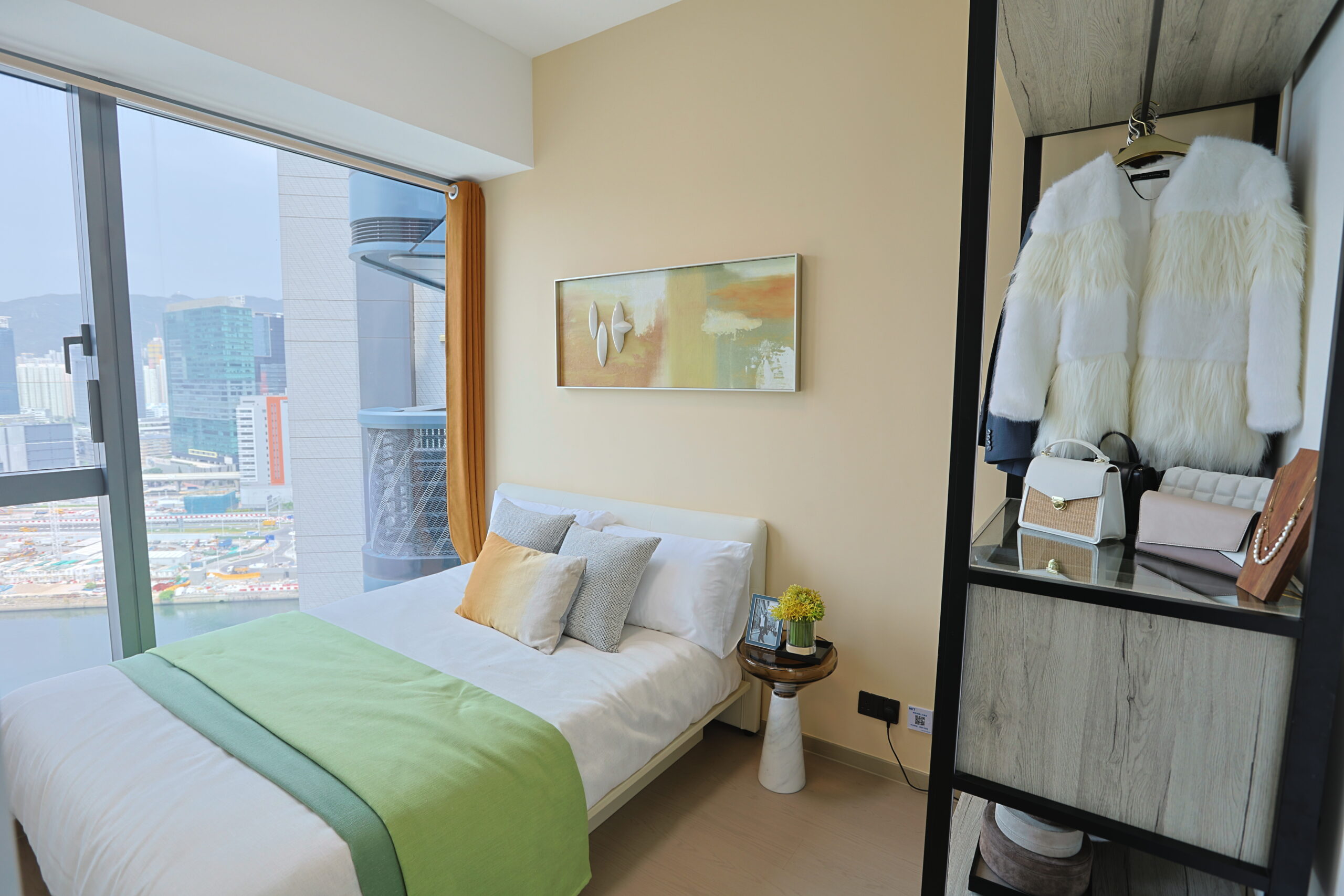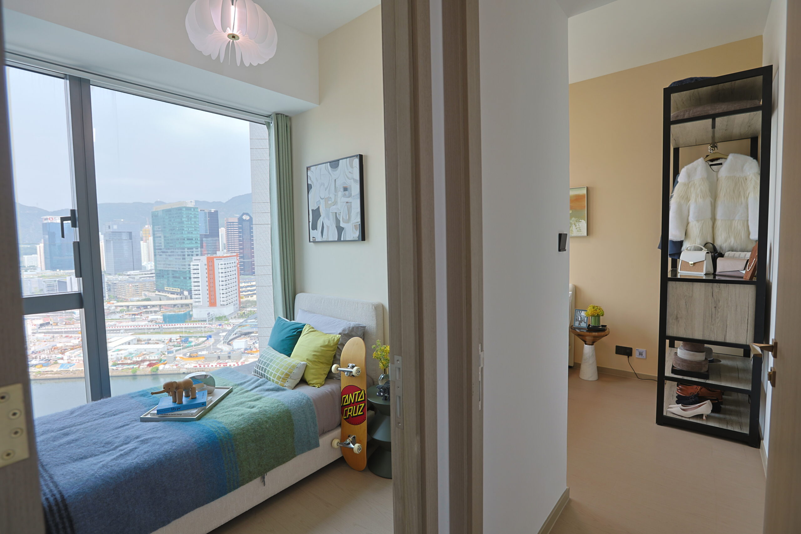 兩個睡房採用靈活設計,滿足家庭成員的不同需求。主人房的玻璃窗將充沛的自然光引入室內, 讓空間感更為開闊舒展。標準雙人床旁的金屬床頭几具收納功能,整體設計簡約實用,展示舒 適感與時尚氣息。另一睡房則呼應單位整體風格,以淺色牆面與暖木地板維持明亮視感,特色 滑板裝置點綴出豐富的潮流氣息,在提供充足儲物空間的同時,也保持了視覺上的通透與簡約。