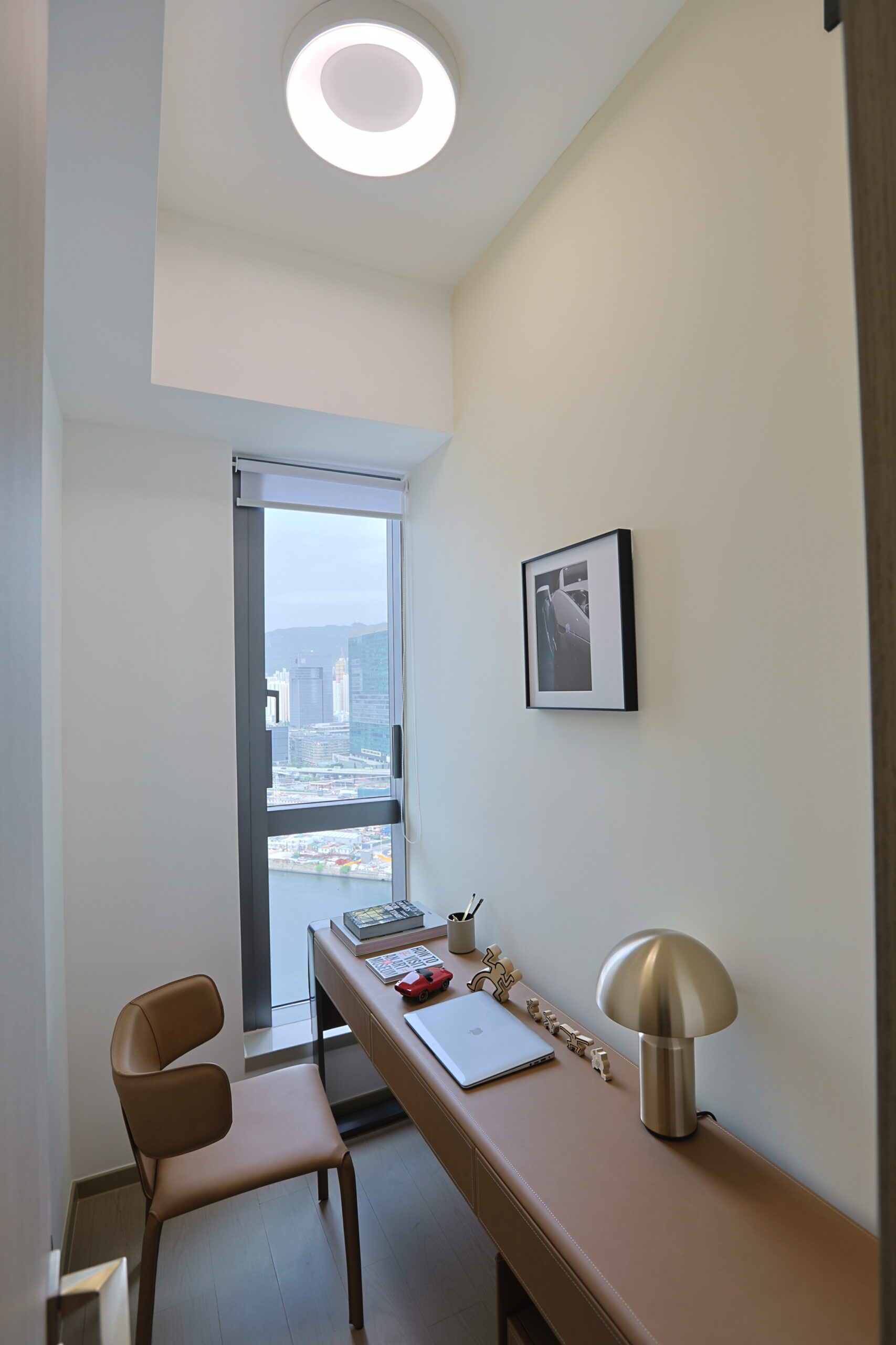 設計師把儲物室打造成書房,選用淺啡色書桌與同色系工作椅,桌面擺放金屬質感檯燈、復古跑車模型與精緻小擺件,既滿足工作與收納功能,同時也呈現出品味的細節。