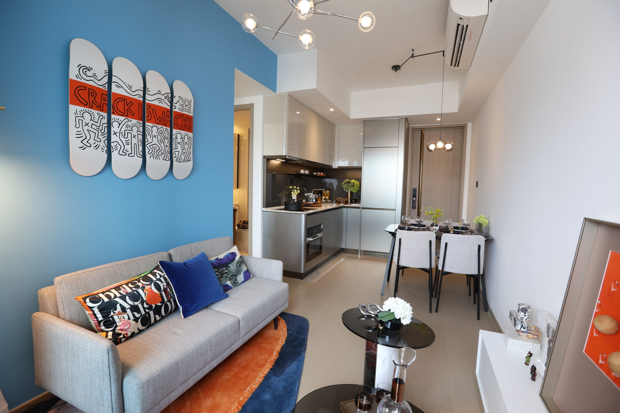 第1C座28樓E室為兩房連儲物室連裝修傢俬(開放式廚房)經改動示範單位,實用面積499方呎。示範單位以年輕、追求潮流品味生活的家庭為設計藍本,以簡潔的線條為主,呈現出年輕品味的都會生活。設計師選用鮮明的藍色作為主調,再以活力的橙色作點綴,營造出時尚而充滿朝氣的空間氛圍。客廳以藍色牆身搭配米白色天花及暖淺的木地板,營造溫暖而明亮的基底。灰調布質沙發與簡約金色企燈形成柔和的質感對比,線條感格紋窗簾與藍橙色地毯則為空間注入活力與節奏;牆上的藝術滑板裝置,為空間注入了豐富的潮流藝術氣息,使每個角落既具生活機能又充滿個性。