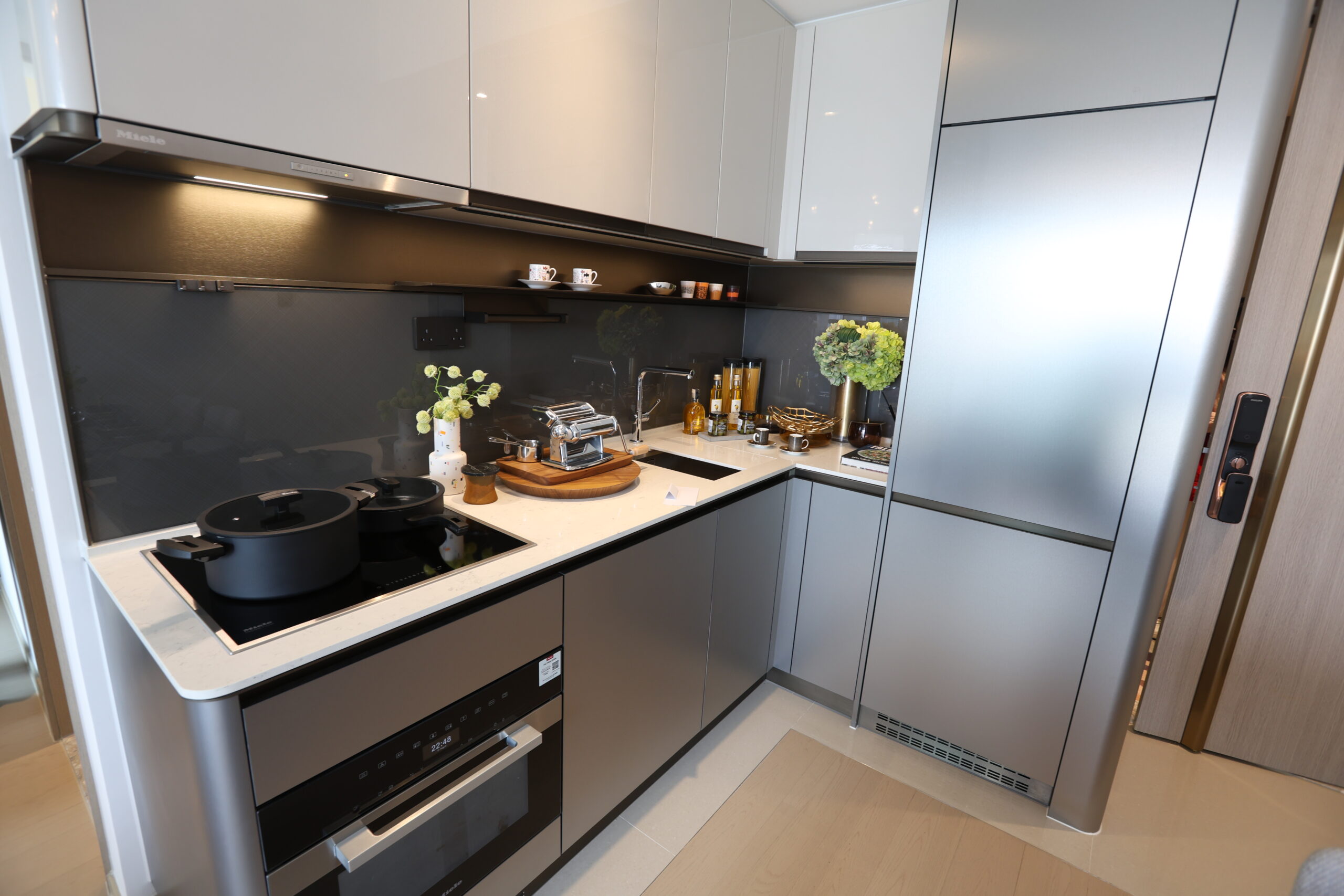 飯廳與廚房以開放式格局打造現代簡約風格,搭配金屬吊燈,四人餐桌配淺啡色織物餐椅配襯 金屬吊燈,並以鮮黃花藝點綴,提升用餐儀式感。相連的廚房採用高級灰與白色光面櫥櫃,搭配嵌入式廚房電器,兼顧現代美感與高效實用的同時,打造風格統一的精緻生活空間。