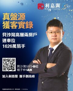 利嘉閣地產貝沙灣分行-D組高級經理雷敏儀(Rebecca)稱,該行客戶董事楊子仲(Ian)新近促成薄扶林貝沙灣6期5座高層B室連車位的二手成交個案,單位實用面積約698方呎,採2房間隔,外望開揚海景。